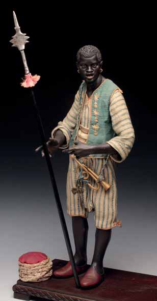 Moro, coppia col n. 8 (lotto precedente) di Giuseppe Gori, (prov. collezione Giacinto Gigante), con orecchini di metallo dorato e indossante un gilet azzurro su pantaloni e camicia fondo giallino con righe azzurre. Altezza cm 38; fine secolo XVIII Accessori: alabarda, tromba e cappello a turbante