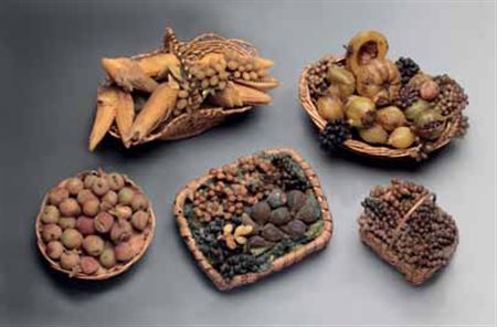 Lotto di cinque cesti di frutta in cera, fine secolo XVIII e inizio secolo XIX, comprendente: a. Cesto ovale con spighe di granone e uva bianca b. Grande cesto, con meloni, limoni, melograni, uva bianca e uva nera c. Grande cesto rettangolare con uva e fichi d. Cestino rotondo, con pesche e. Cestino quadrato con manico contenente uva bianca, rossa e nera