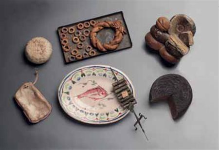 Lotto di sei pietanze, fine secolo XVIII e inizio secolo XIX, comprendente: a. Piatto ovale di maiolica decorato con pesce b. Teglia da forno con taralli e ciambellone c. Caciottella d. Forma di formaggio tagliata di un quarto e. Pila di formaggi (dono di Vincenzo Catello sett. 47) f. Spiedino in ferro con infilata di pezzi di anguilla arrosto g. Pezzo di lardo con spago per appendere