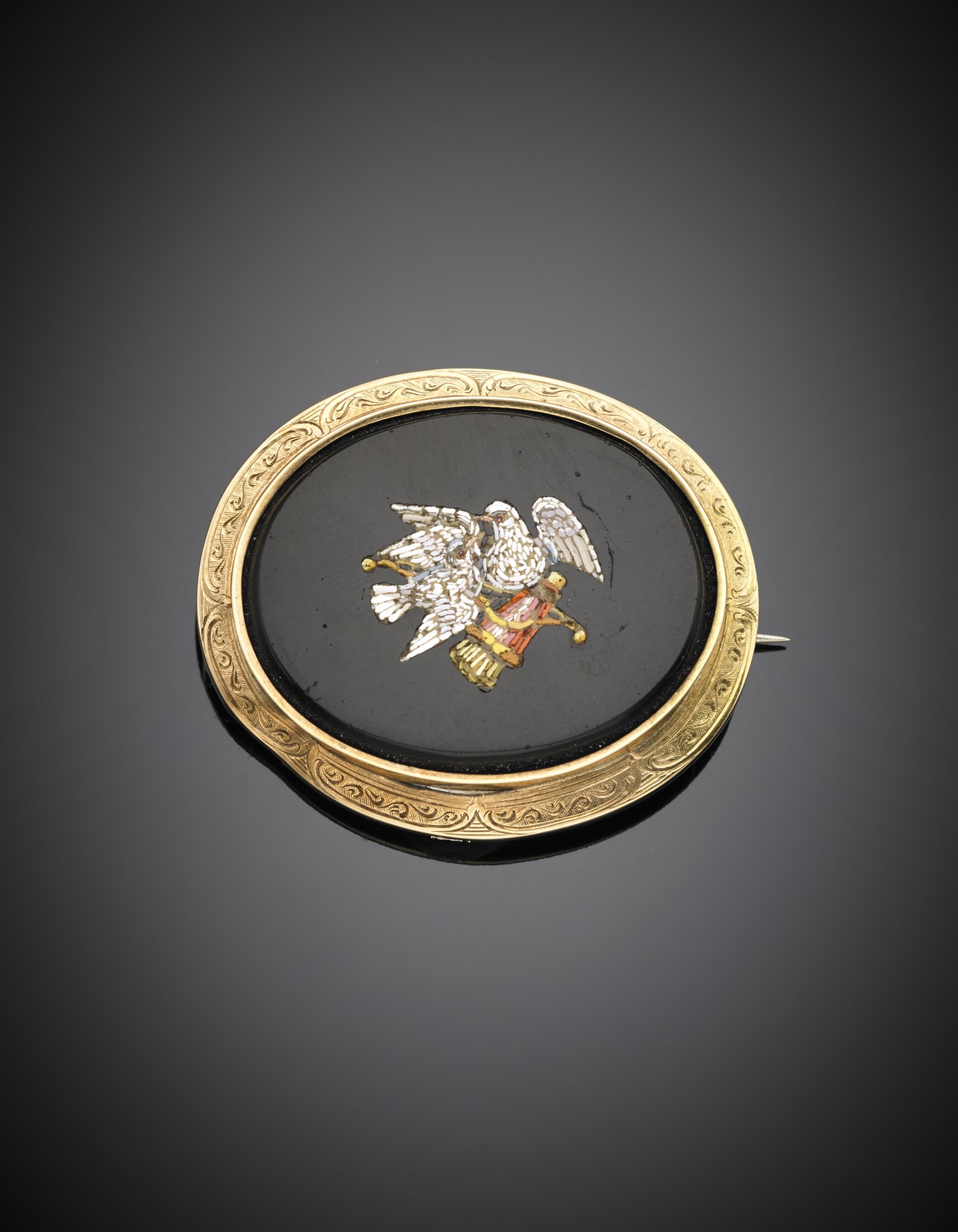 Spilla in oro giallo 585/1000 con micromosaico raffiguarante due colombe su onice, g. 15,10, lungh. cm 4,70 circa 14K yellow gold micro-mosaic on onyx brooch