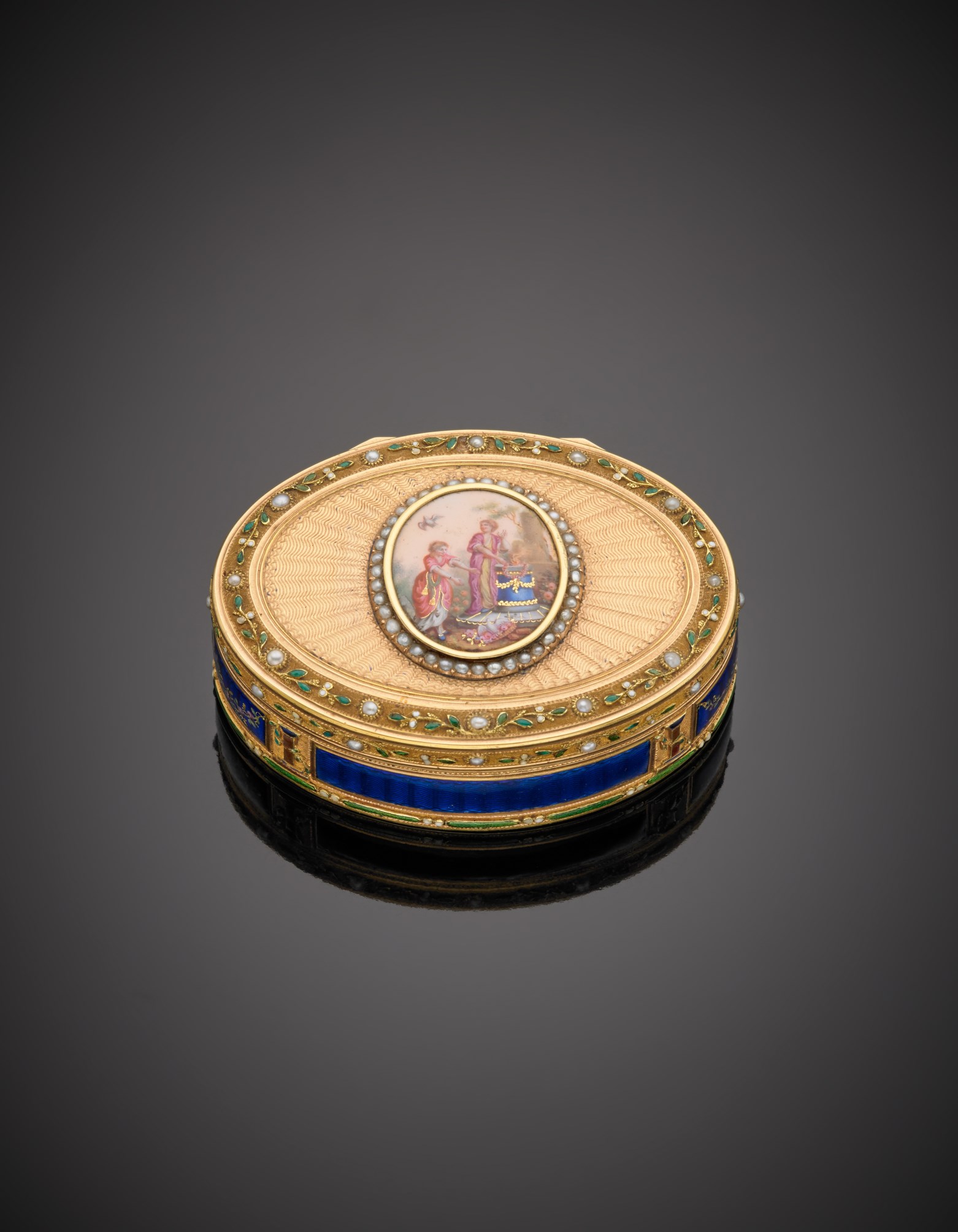 Tabacchiera ovale in oro giallo lucido e zigrinato, smalti guillochè blu e piccole perle, al centro ovale in smalti policromi (difetto), g.69,50, lungh. cm 6,80, largh. cm 5,00, h cm 2,10 Yellow gold, enamel and pearls chiselled snuffbox