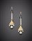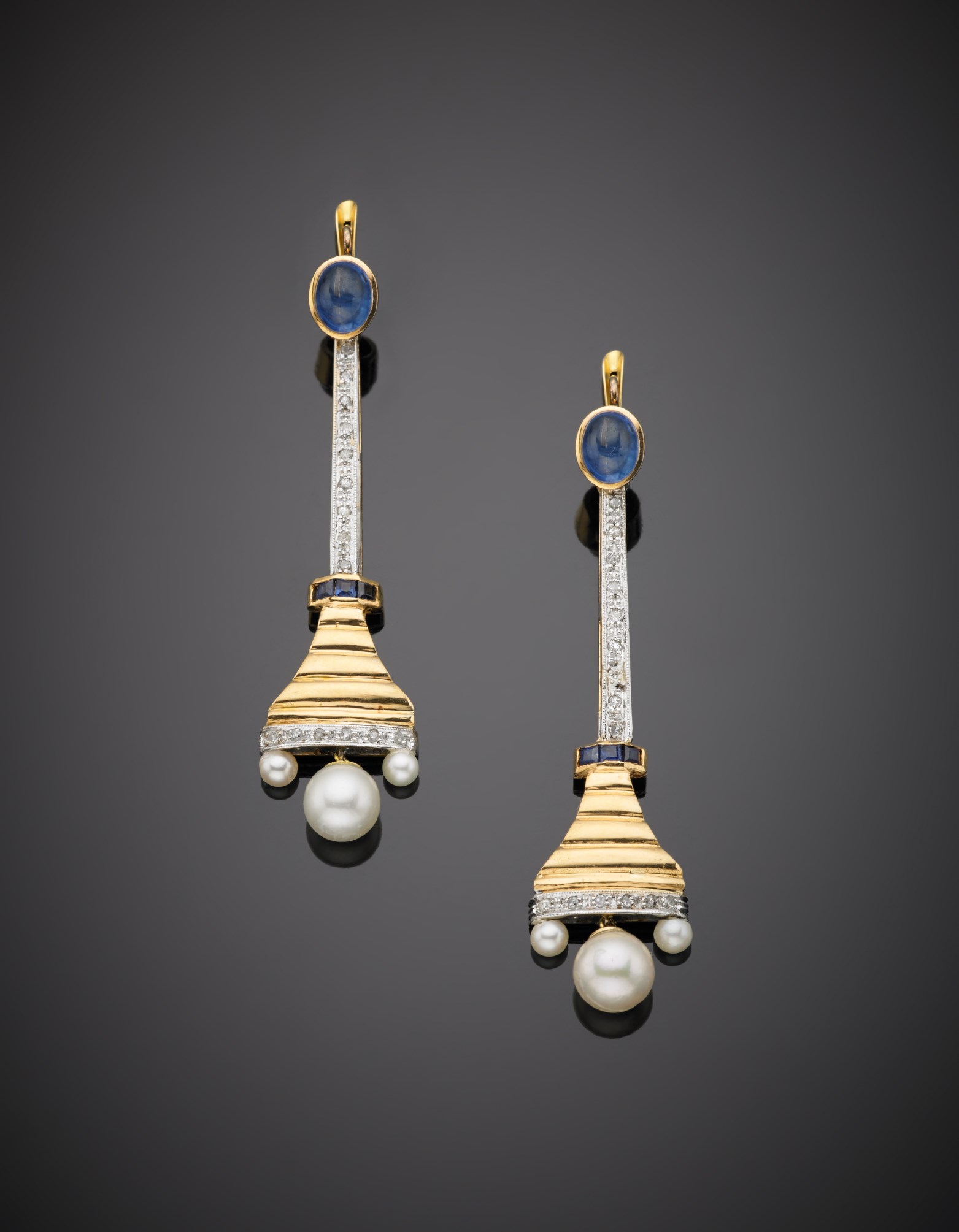 Orecchini pendenti "Tour Eiffel" in oro giallo e bianco con zaffiri, diamanti e perle g. 13,20, lungh. cm 6,20 (le monachella sono in oro 585/1000) A bi-coloured gold sapphire, diamond and pearl ear-pendants