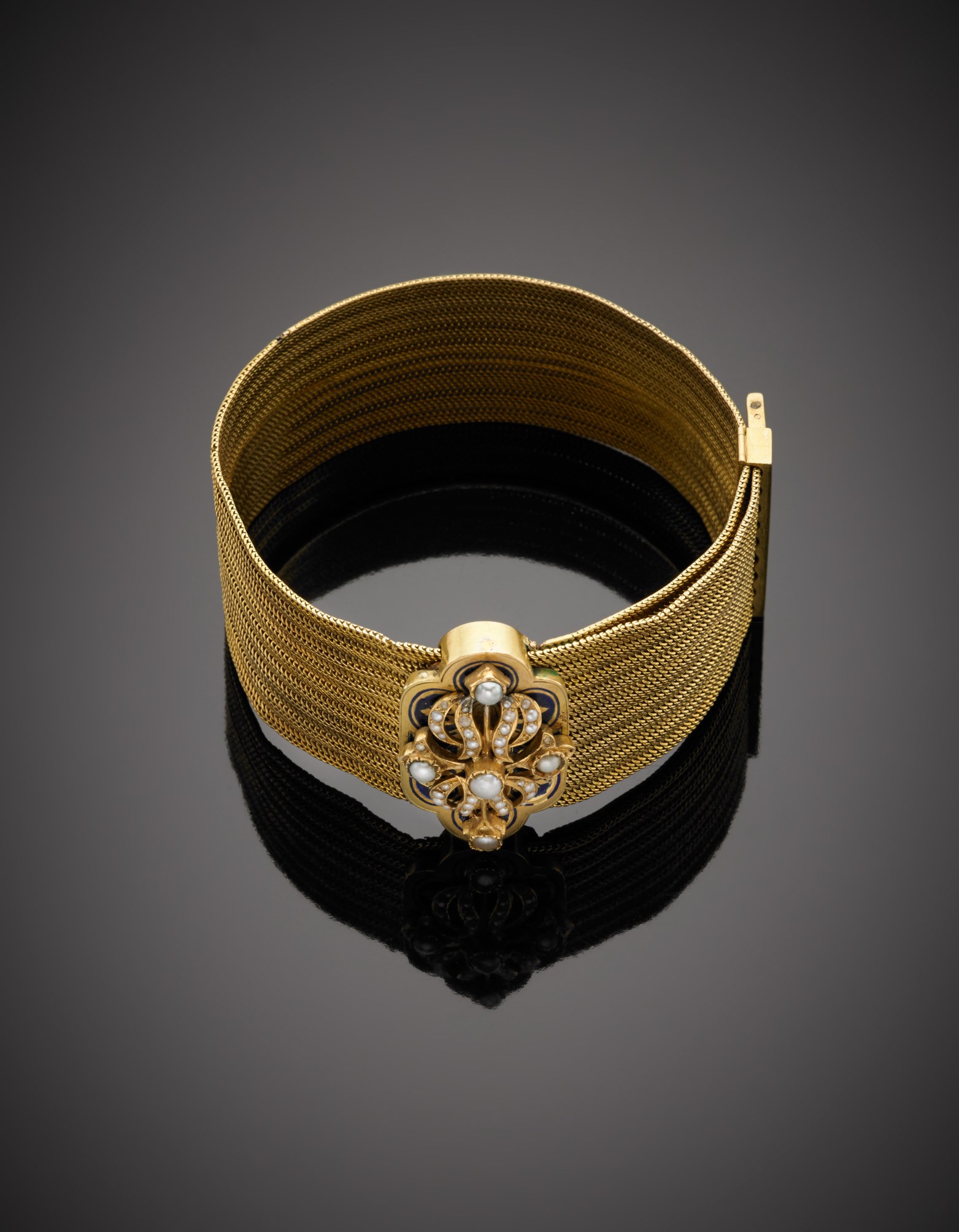 Lot 33 | Bracciale in oro giallo con chiusura in rilievo, smalti blu e microperle,...