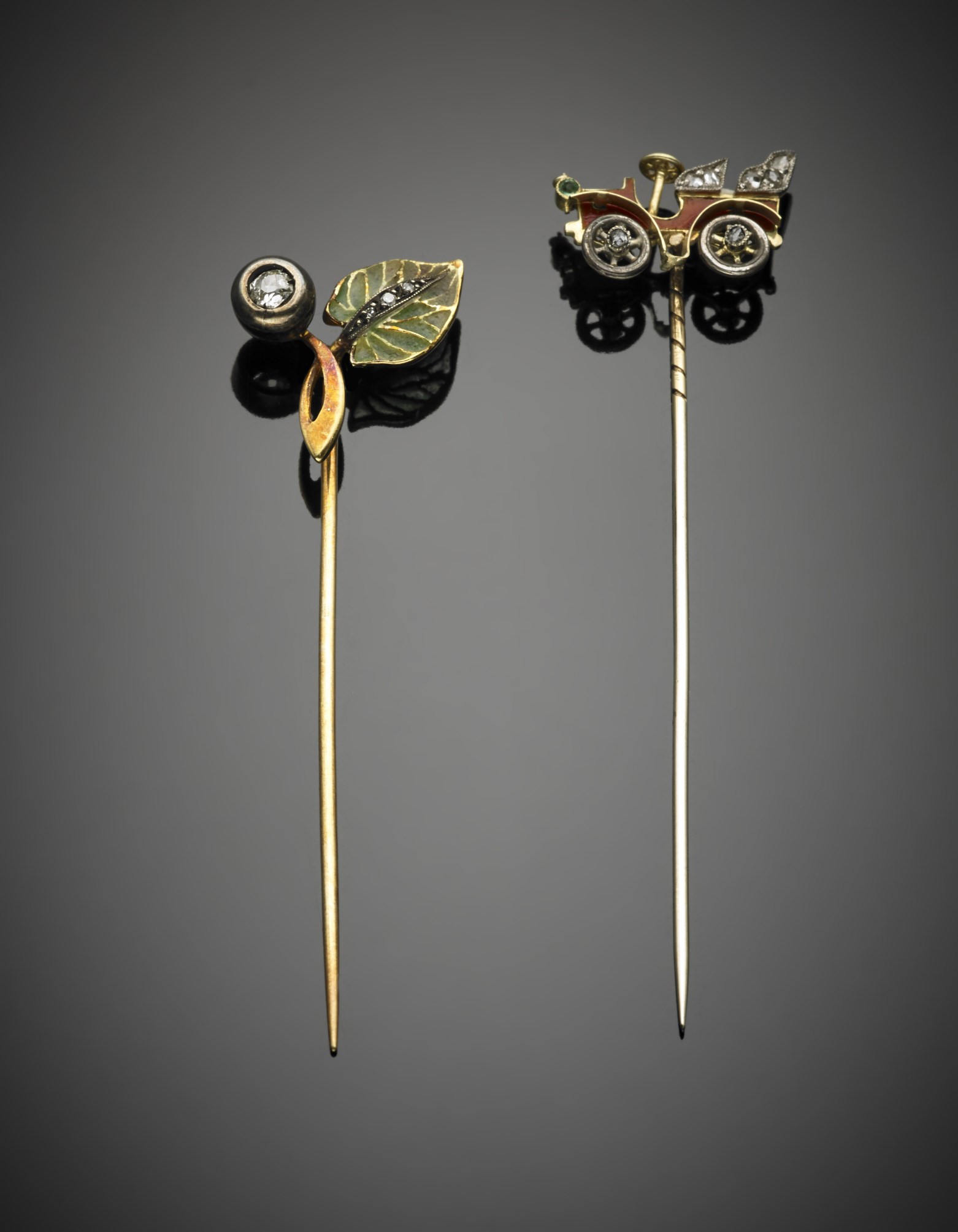 Lot 34 | Due spilloni da cravatta in oro giallo e platino con diamanti e smalti a...