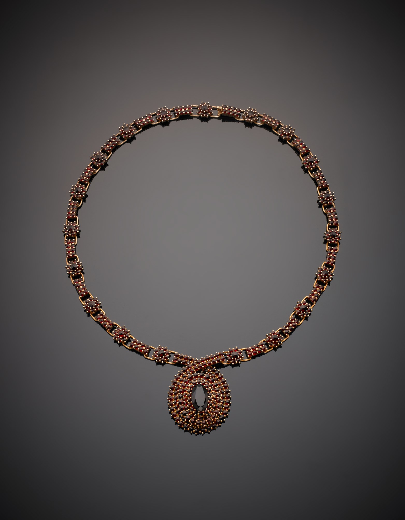 Collier in oro rosso 333/000, con granati rotondi ed uno ovale al centro del centrale, g. 43,50. Punzoni HE e 830S 9K red gold and garnet necklace