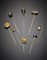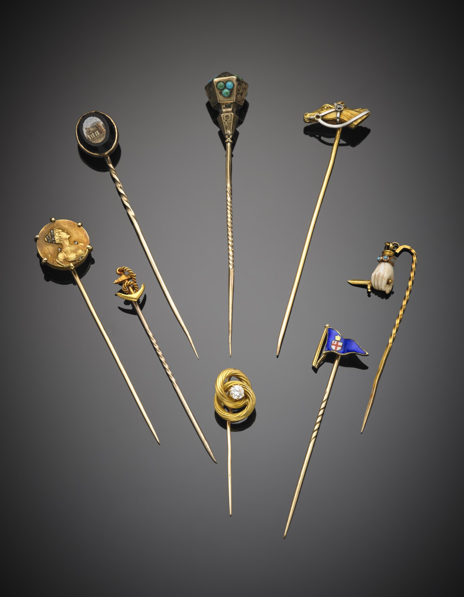 Lotto di otto spilloni da cravatta in oro giallo, con diamanti, turchesi, mosaici e smalti, g.17,00 Eight yellow gold tie pins with diamonds, turquoise, mosaic and enamel