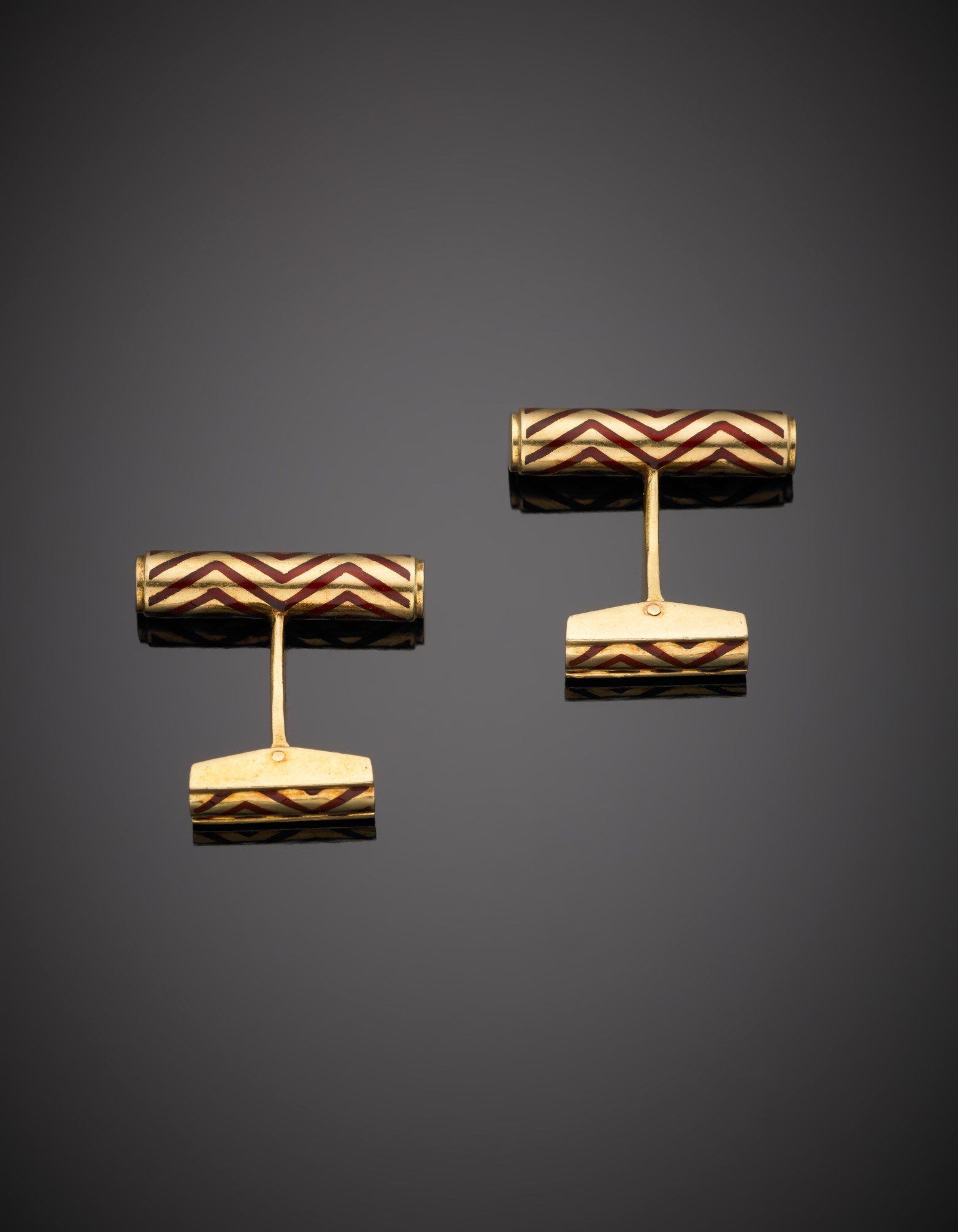 GERARD Gemelli in oro giallo con smalto guilloche bordeaux e nero g. 14,40. Punzone tete d'aigle e RB, firmato M. Gerard SB 88. In scatola originale Gold and guillochè enamel cuff-links