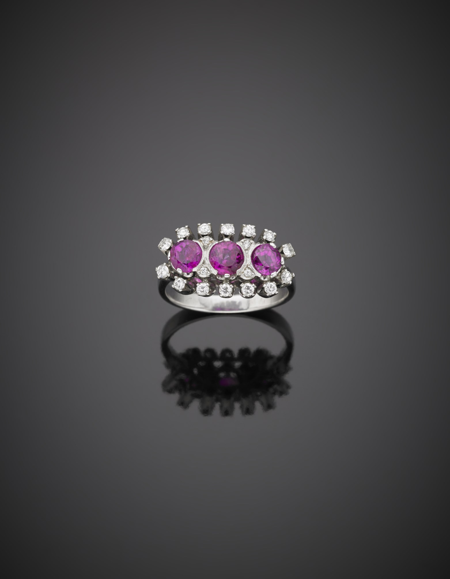 Anello in oro bianco con tre rubini rotondi e diamanti g.6,40 misura 18/58 A...