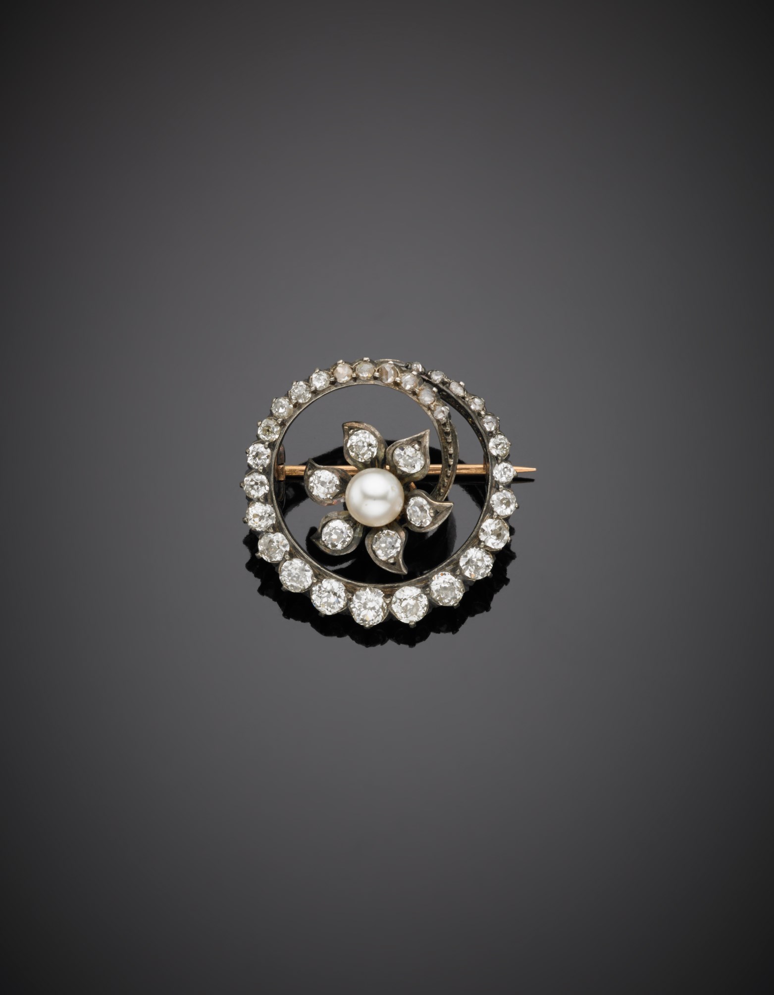 Spilla in oro rosso e argento, con diamanti scalati a formare un fiore, al centro una perla bianca g. 7,50, diam. cm 2,80 A diamond and pearl red gold and silver brooch