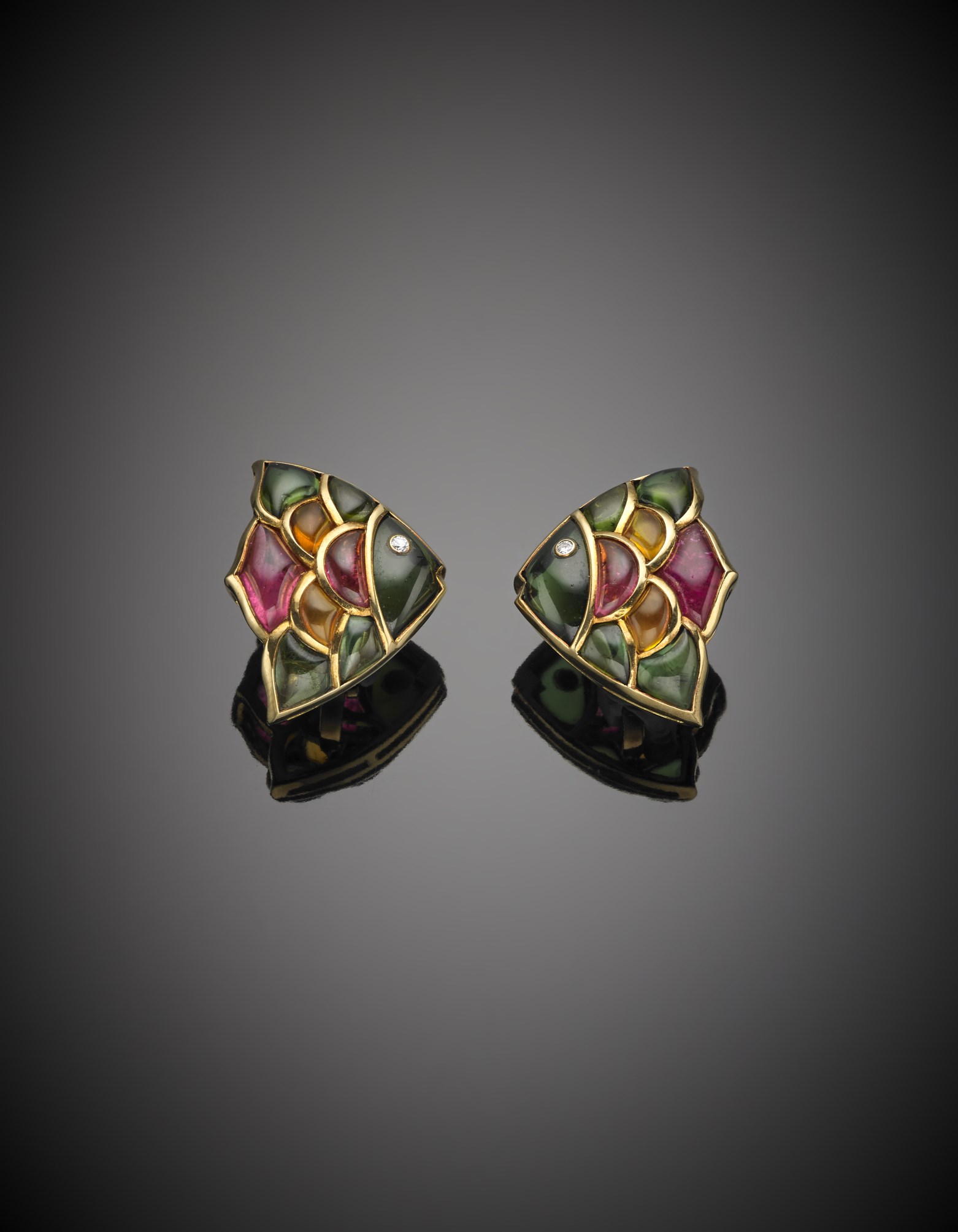 BULGARI-Naturalia Marina Orecchini in oro giallo con tormaline rosa, peridoti, citrini e diamanti, g. 17,30 Pubblicato a pag. 360 del libro edito da SKIRA "Tra eternità e storia - BULGARI - 125 anni di gioielli italiani" A pair of multi-colour gemstone earrings Published on pg. 30 of the SKIRA book
