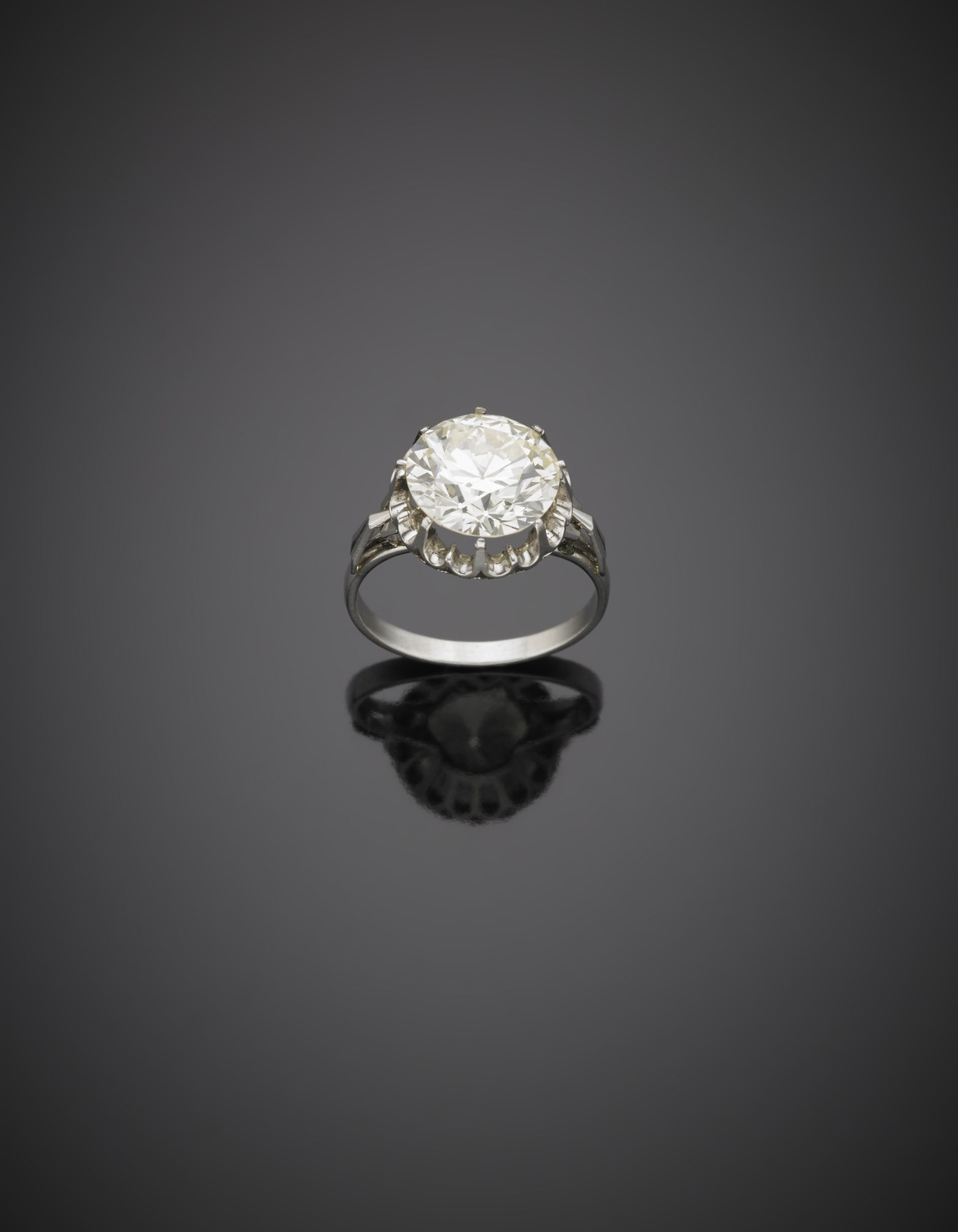 Diamante rotondo di ct.4,54. Con montatura in platino, g.4,10, misura 14/54 Accompagnato da analisi gemmologica del CISGEM n.4201IAAB Milano del 16/09/2016 A platinum single stone diamond ring Appended CISGEM jewellery certificate