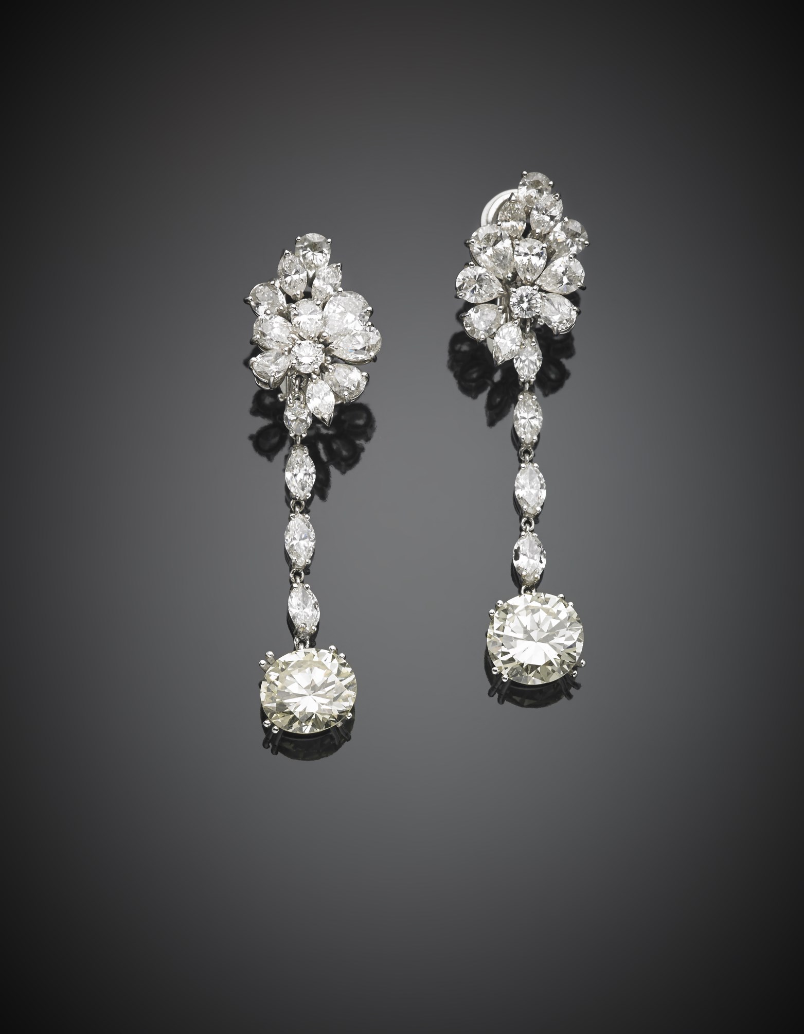 Orecchini pendenti terminati con due diamanti rotondi di ct.5,42 e ct.5,28, in oro bianco e rifiniti con diamanti taglio navette e a goccia, per complessivi ct 12 circa, g. 17,40, lungh. cm 7,6 Accompagnati da certificati gemmologici CISGEM n.4411IAAB e n.4412IAAB del 10/10/2016, Milano Pendant earrings with two round diamonds ct.5,42 e ct.5,28, and diamond Appended Diamonds Certificate CISGEM n.4411IAAB and n.4412IAAB Milano 10/10/2016