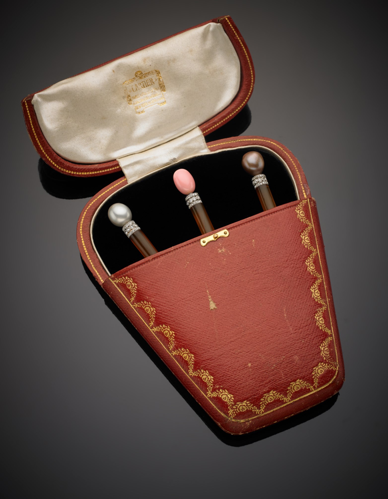 CARTIER Tre hairpins, rifiniti in oro bianco, diamanti e tre perle naturali d'acqua salata, le perle sono così descritte: -naturale grey di acqua salata, ct 8,75 Accompagnata da certificato gemmologico The Gem & Pearl Laboratory nᄚ 05325 del 9 Marzo 2012 -naturale brown di acqua salata, ct 8,33 Accompagnata da certificato gemmologico The Gem & Pearl Laboratory nᄚ 05326 del 9 Marzo 2012 - naturale conch pearl, ct 8,20 Accompagnata da certificato gemmologico The Gem & Pearl Laboratory nᄚ 05327 del 9 Marzo 2012 Punzone dell'aquila, e numeri di serie, uno ben leggibile 2374. In scatola originale CARTIER Three white gold and diamond hairpins, each set with a different natural, salt water pearl: a grey, a brown and a conch Appended Jewellery Certificate The Gem & Pearl Laboratory nᄚ 05325 del 9 Marzo 2012, The Gem & Pearl Laboratory nᄚ 05326 del 9 Marzo 2012, The Gem & Pearl Laboratory nᄚ 05327 del 9 Marzo 2012