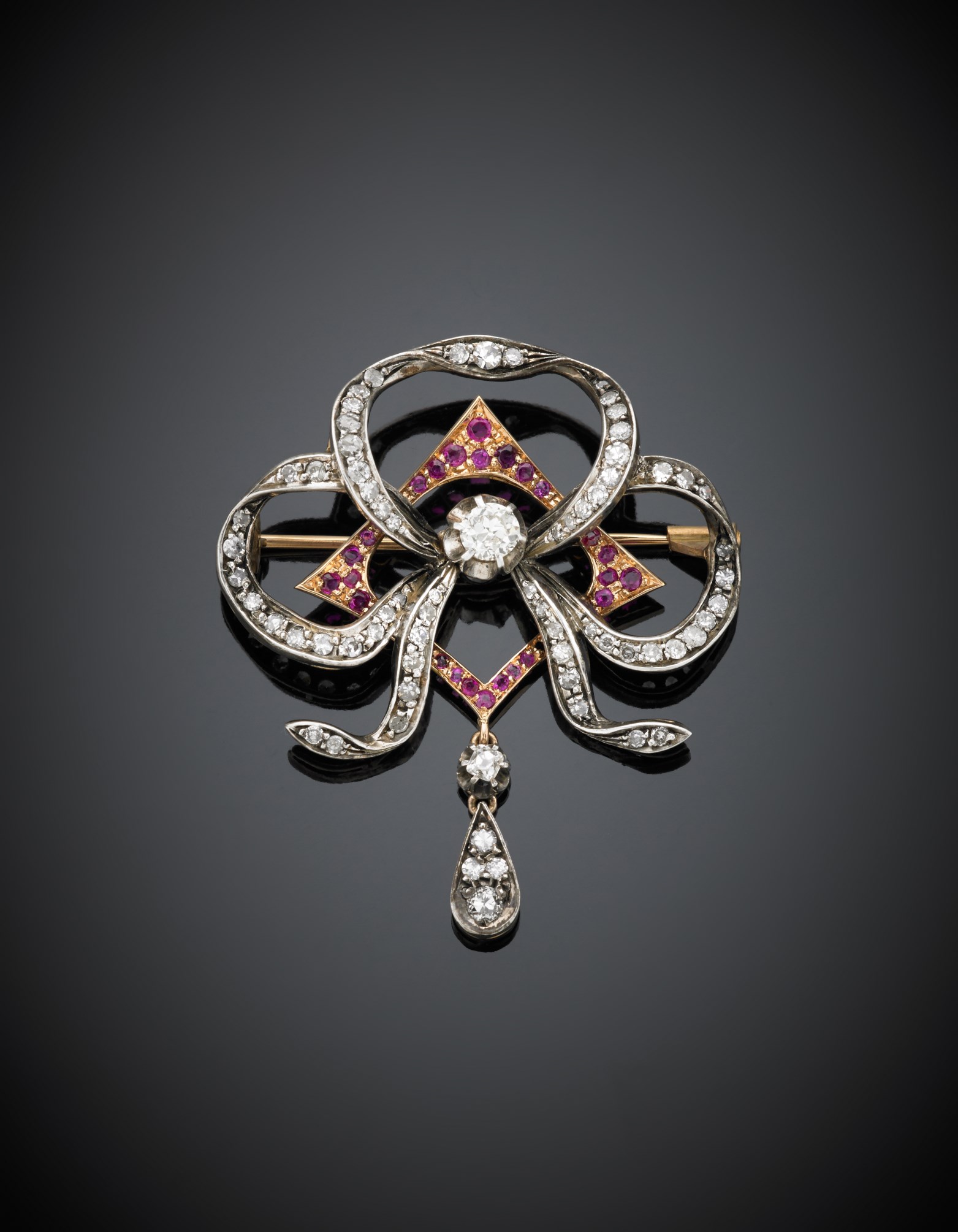 Spilla in oro giallo e argento, a guisa di fiocco, con diamanti e rubini g....