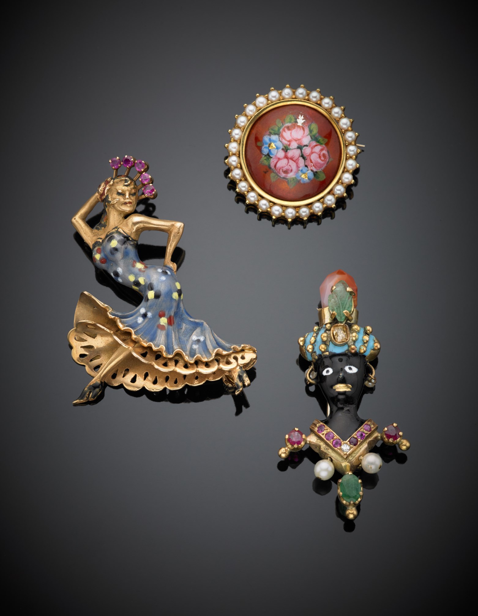 Lotto composto tre spille in oro giallo una a guisa di moro, una di ballerina ed una rotonda rifinite con smalti, perle, e pietre preziose varie g. 34,90 Lot comprising three gold brooches with enamels and pearls
