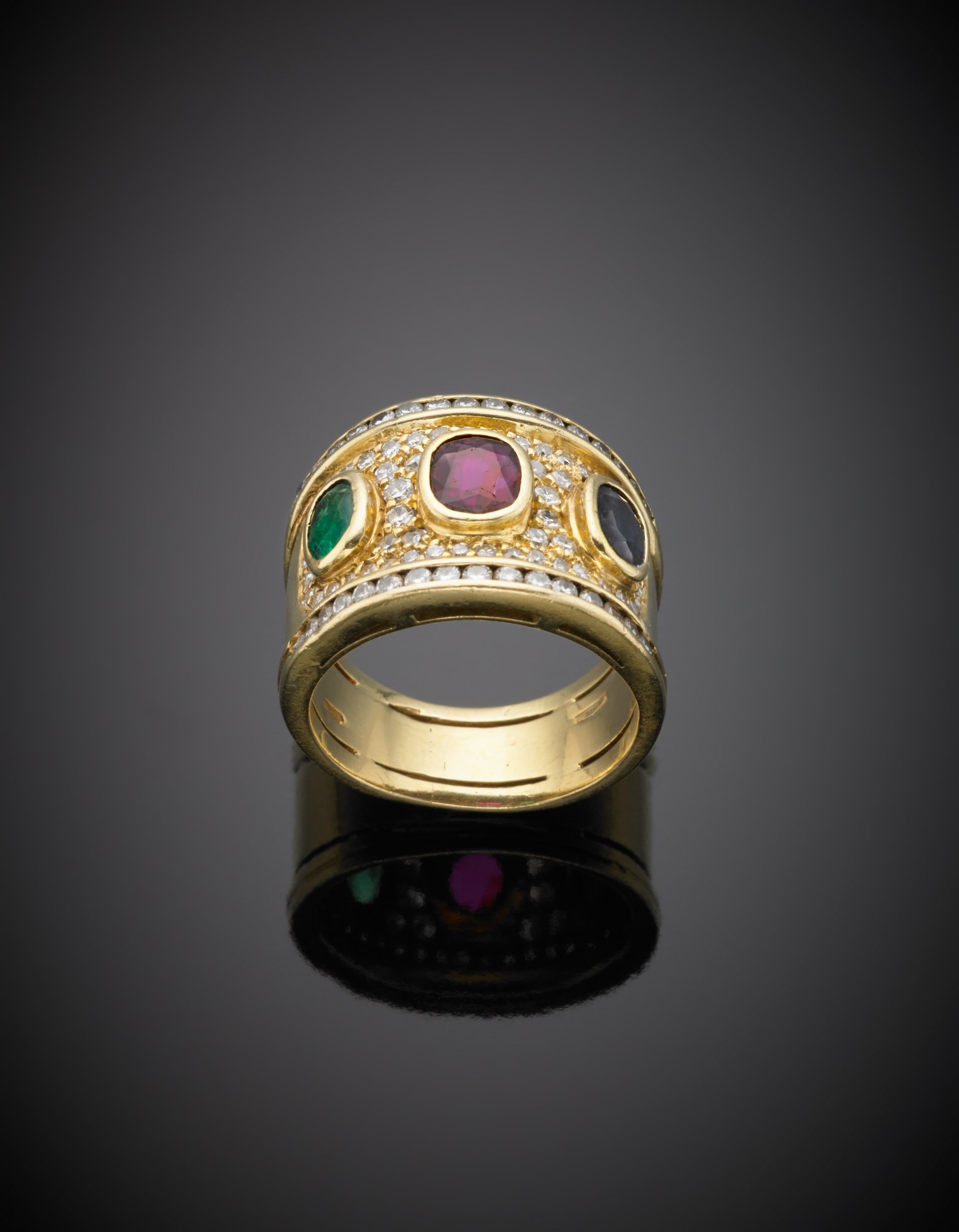 Anello in oro giallo a fascia con diamanti rotondi, uno zaffiro, un rubino ed...