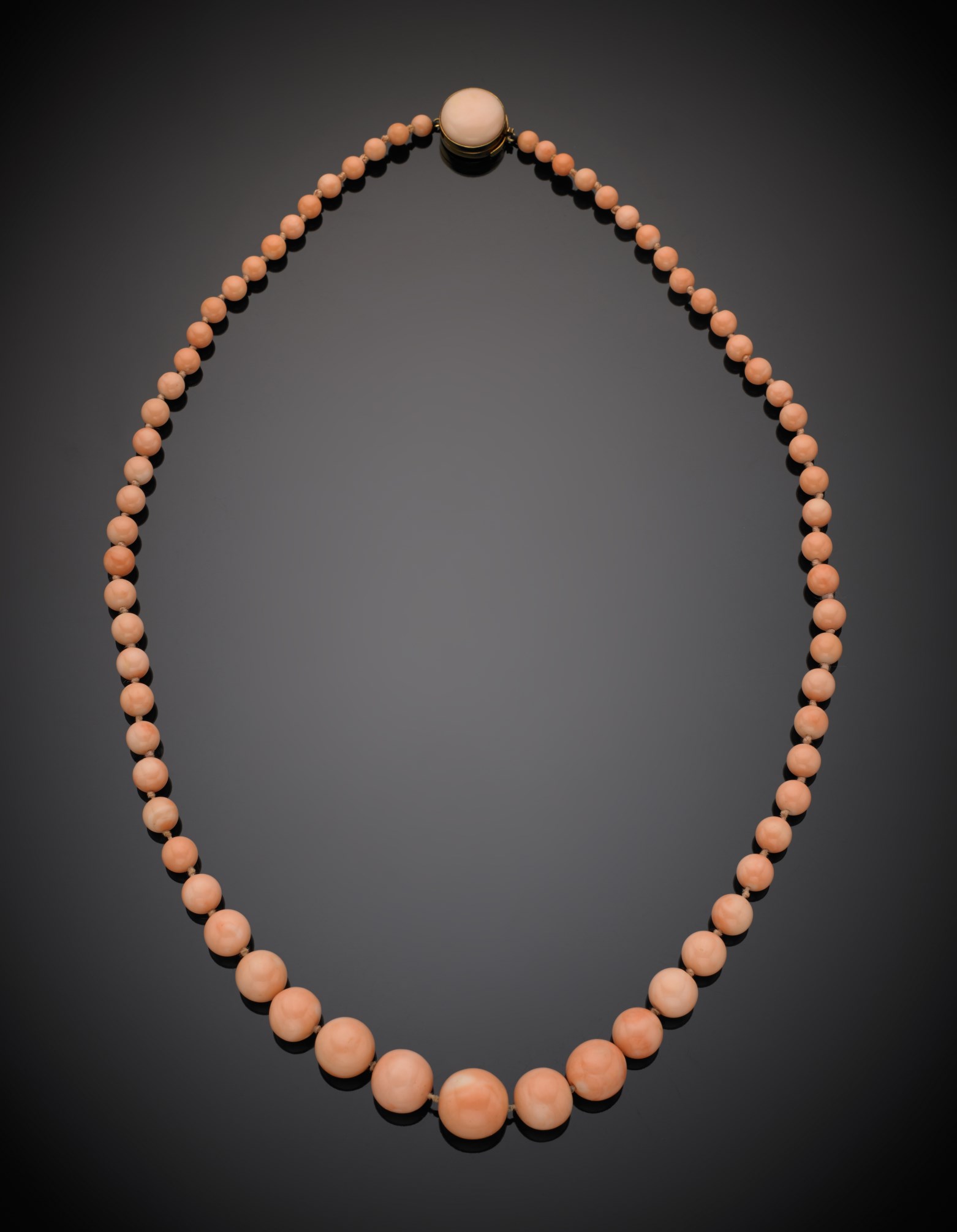 Collana in corallo rosa variegato da mm 5 a mm16 chiusura in oro giallo sempre con corallo cabochon rosa, g. 74,50 lungh. cm 69 Mottled pink coral necklace with coral and gold clasp
