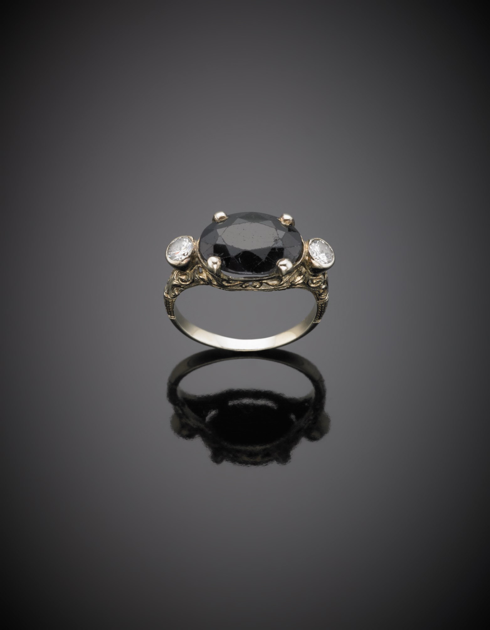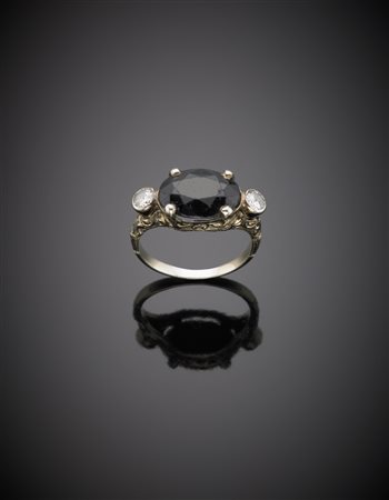 Anello in oro bianco cesellato con zaffiro ovale taglio composito di ct 5 circa e due diamanti rotondi taglio a brillante, g. 3,6 circa misura 11/51 Accompagnato da descrizione scritta IGI n. 874V Milano 19/05/2016, che certifica l'assenza di evidenze da riscaldamento White gold diamond and sapphire ring, treatment not observed Appended IGI written description