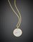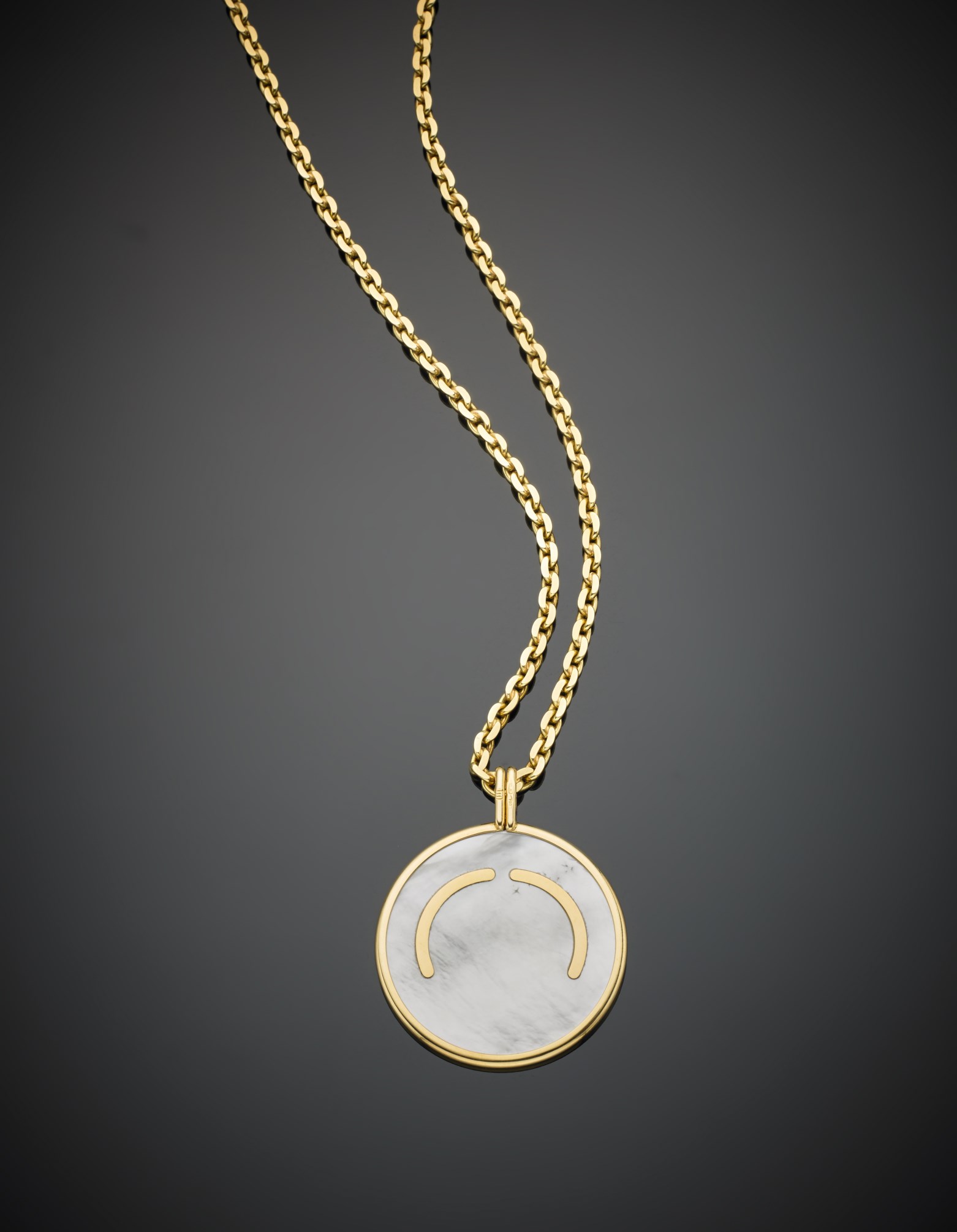 Catena in oro giallo con pendente rotondo del segno zodiacale del leone rifinito in madreperla, g. 52,80. lungh. catena cm 68 circa A gold chain with a lion zodiac sign pendant