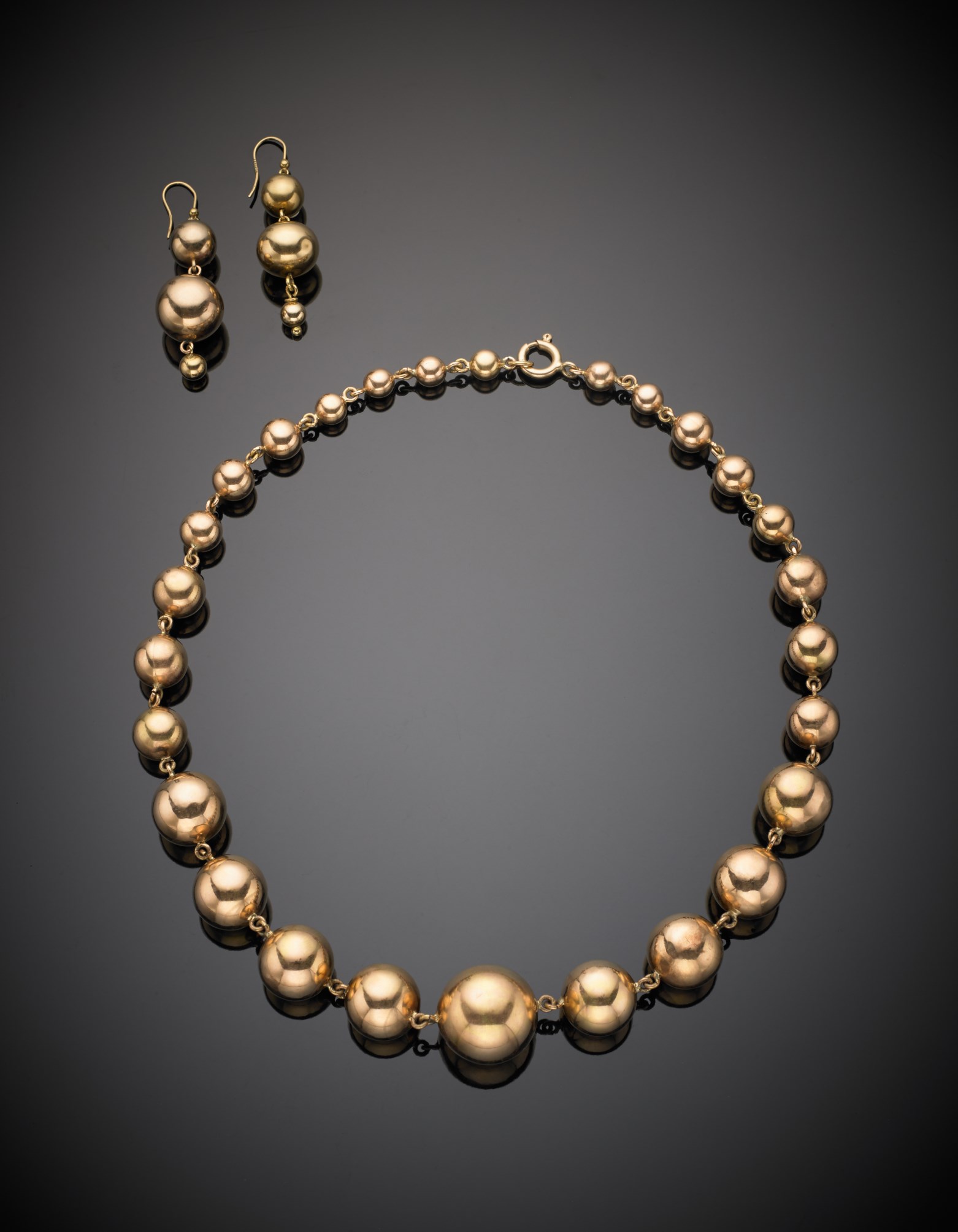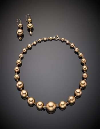 Demi-parure in oro rosso 585/1000 a guisa di boules con collana scalata da mm 7 a mm 21, lungh. cm 47, orecchini pendenti complessivi g. 50 Red gold suite of jewellery comprising a graduated necklace and pendant earings