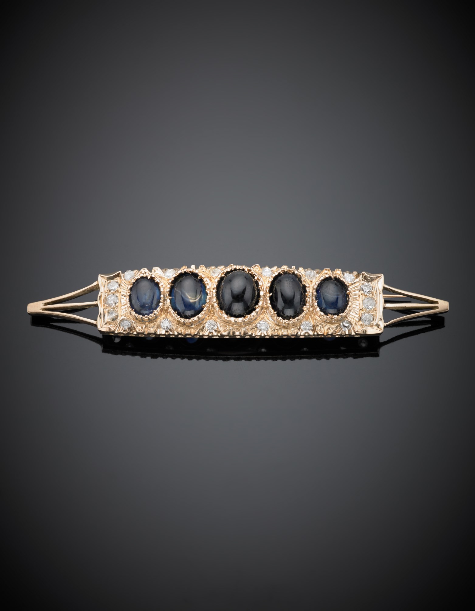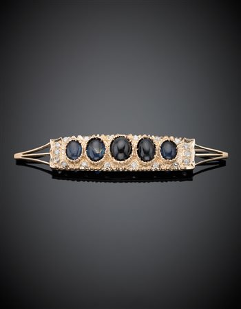 Spilla in oro rosso con diamanti rotondi e zaffiri cabochon degradati dal centro verso i lati g. 14,50 lungh. cm 8,50 circa Sapphire and diamond red gold brooch