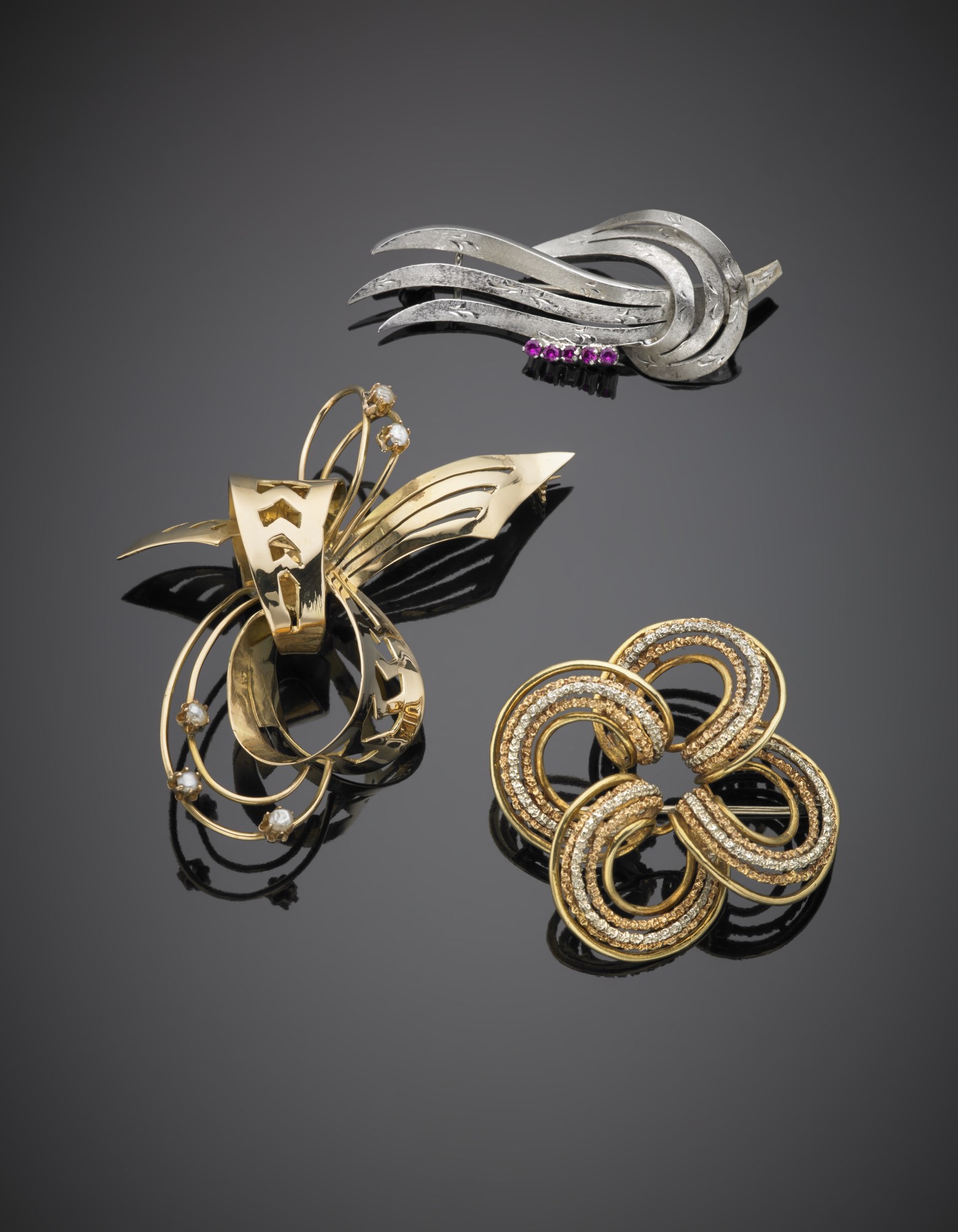 Lotto composto da tre spille in oro bianco e giallo, con rubini e piccole...