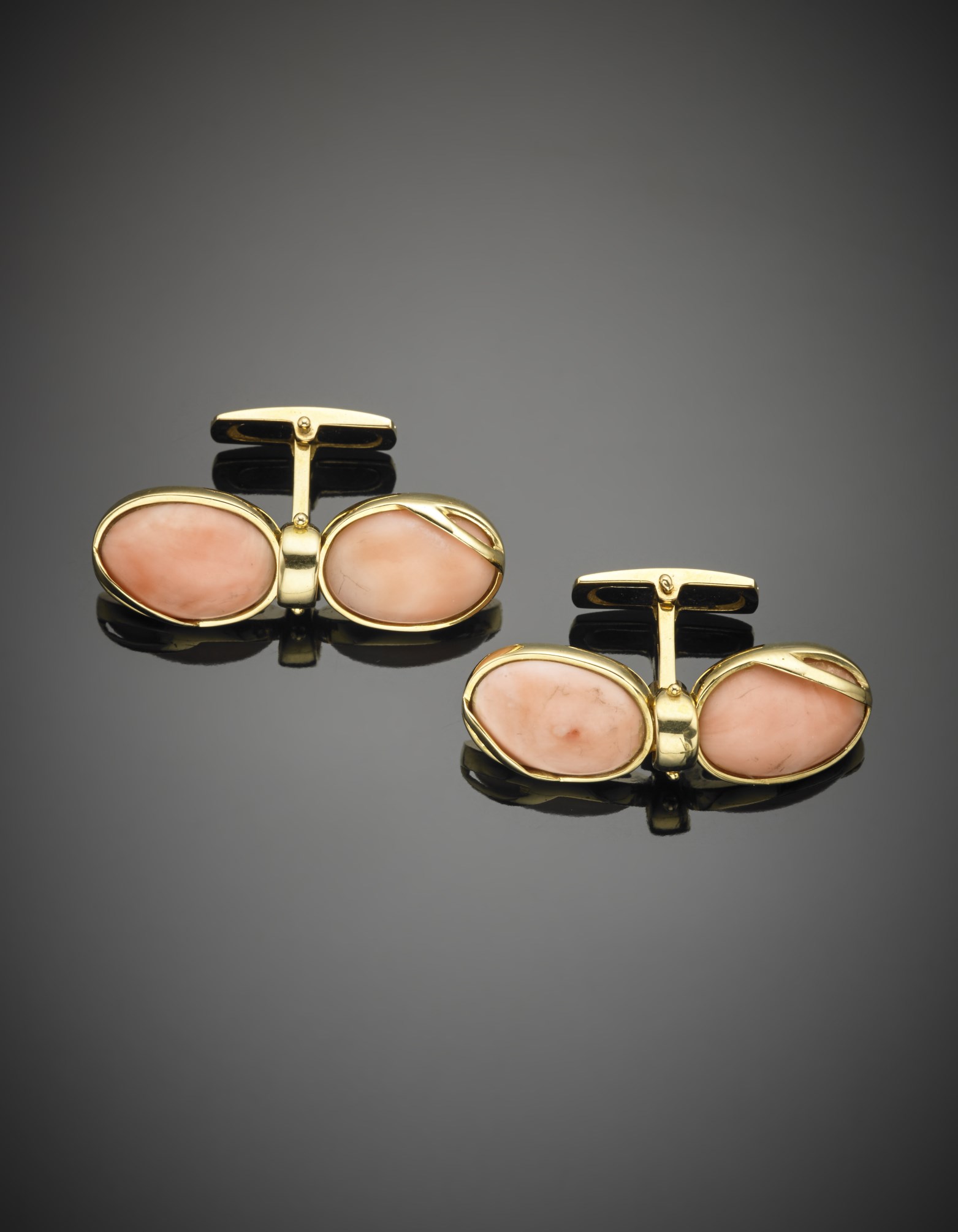 Gemelli in oro giallo con quattro coralli rosa ovali cabochon g. 18,30 A pair of pink coral gold cuff-links