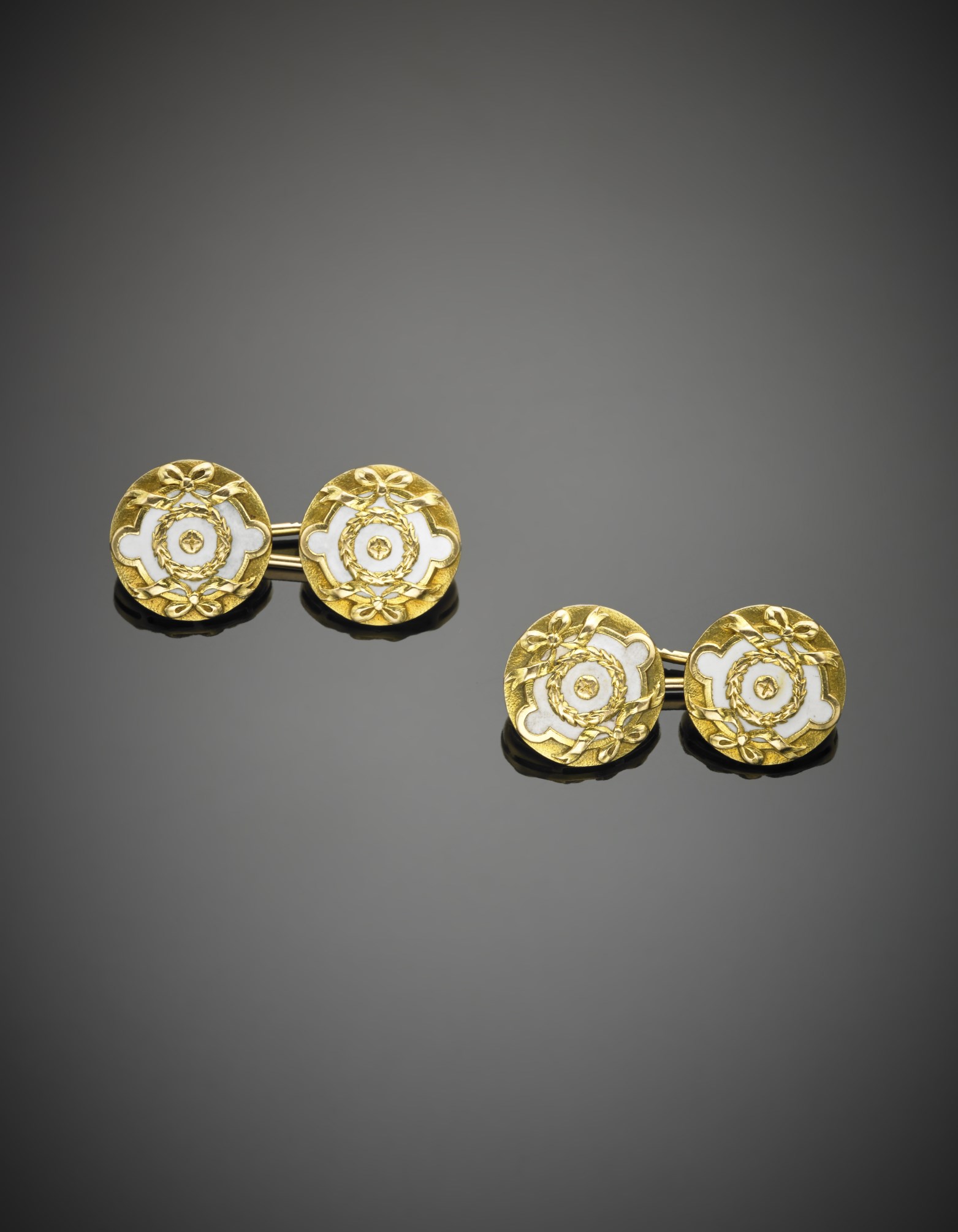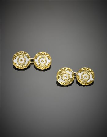 Gemelli in oro giallo e smalti bianchi g. 14,30 Yellow gold and white enamel...