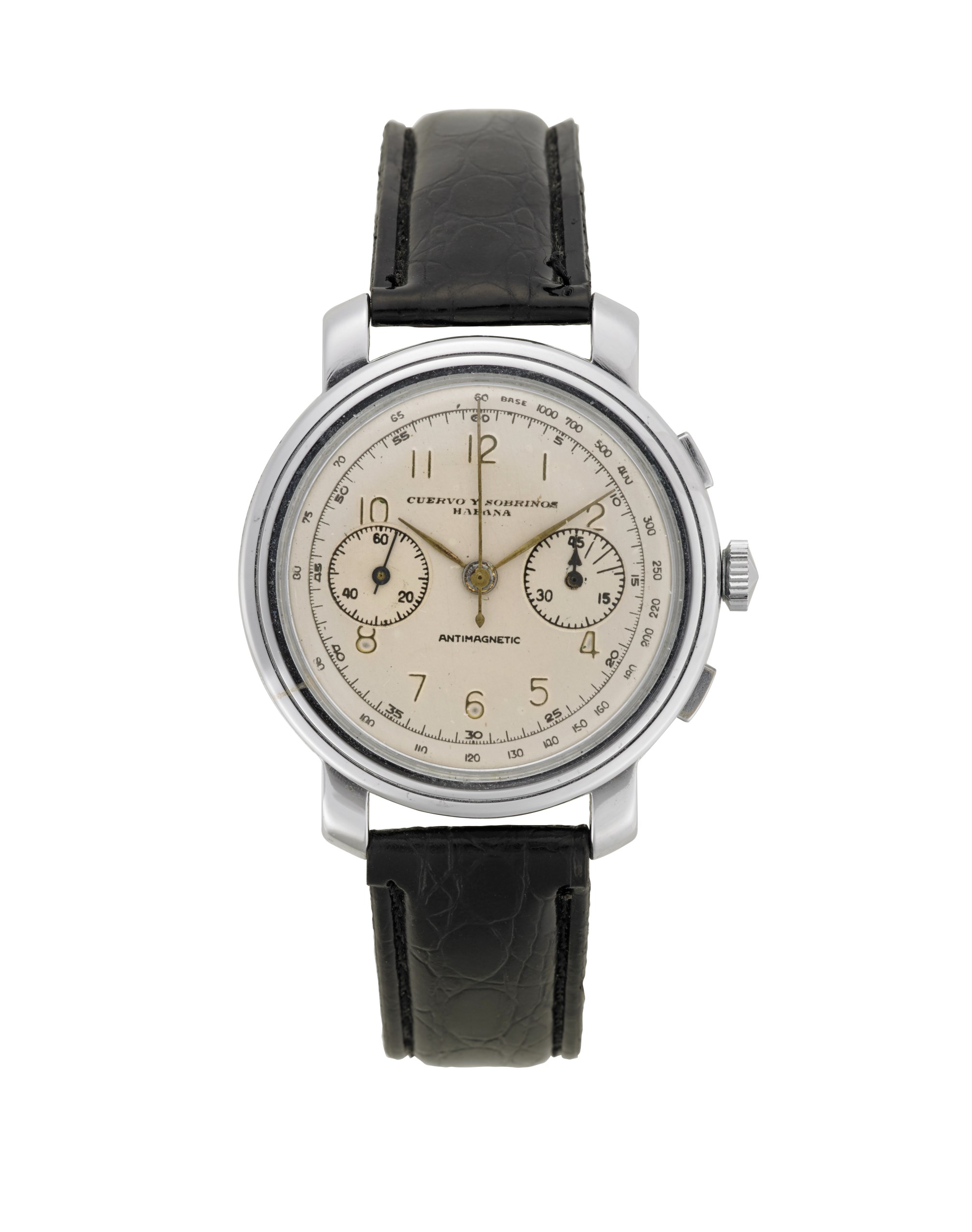 CUERVO SOBRINOS, Cronografo Orologio da polso da uomo in metallo cromato Anni '60 circa Quadrante e movimento firmati Movimento con carica manuale Quadrante argentato con cifre arabe, secondi al centro, quadrantini ausiliari per minuti e secondi continui Cassa n. 8610 Diam. mm 40 (probabile ristampa) CUERVO SOBRINOS Chronograph Gent's chromed metal wristwatch 1960s circa Dial and movement signed Silvered dial with Arabic numerals and auxiliary dials Diam. mm 40 (Probably reprinted)