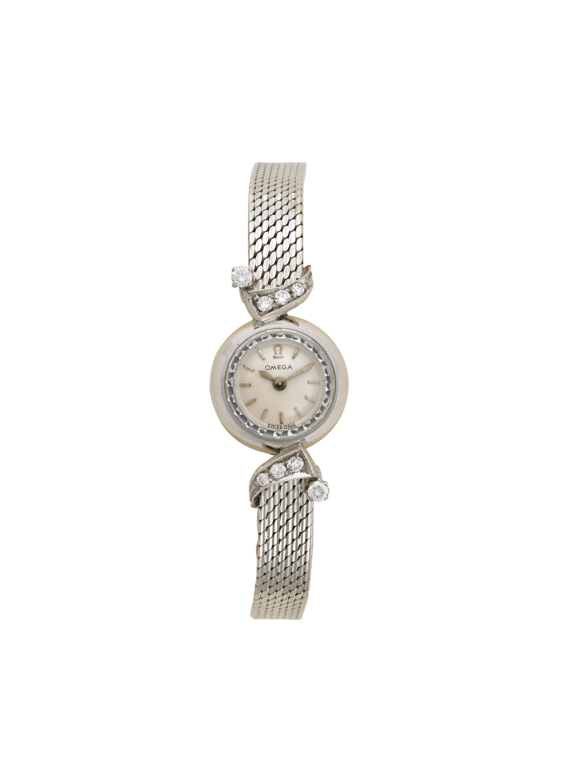 OMEGA Orologio da polso da donna in oro 18K e diamanti, con bracciale originale Anni '60 Quadrante, movimento e cassa firmati Movimento con carica manuale duoplan Quadrante argentato con indici riportati Diam. mm 16 In scatola originale con garanzia OMEGA Lady's 18K gold and diamonds wristwatch Signed dial manual wind movement Silvered dial, applied indexes Diam. mm 16 With original box and guarantee