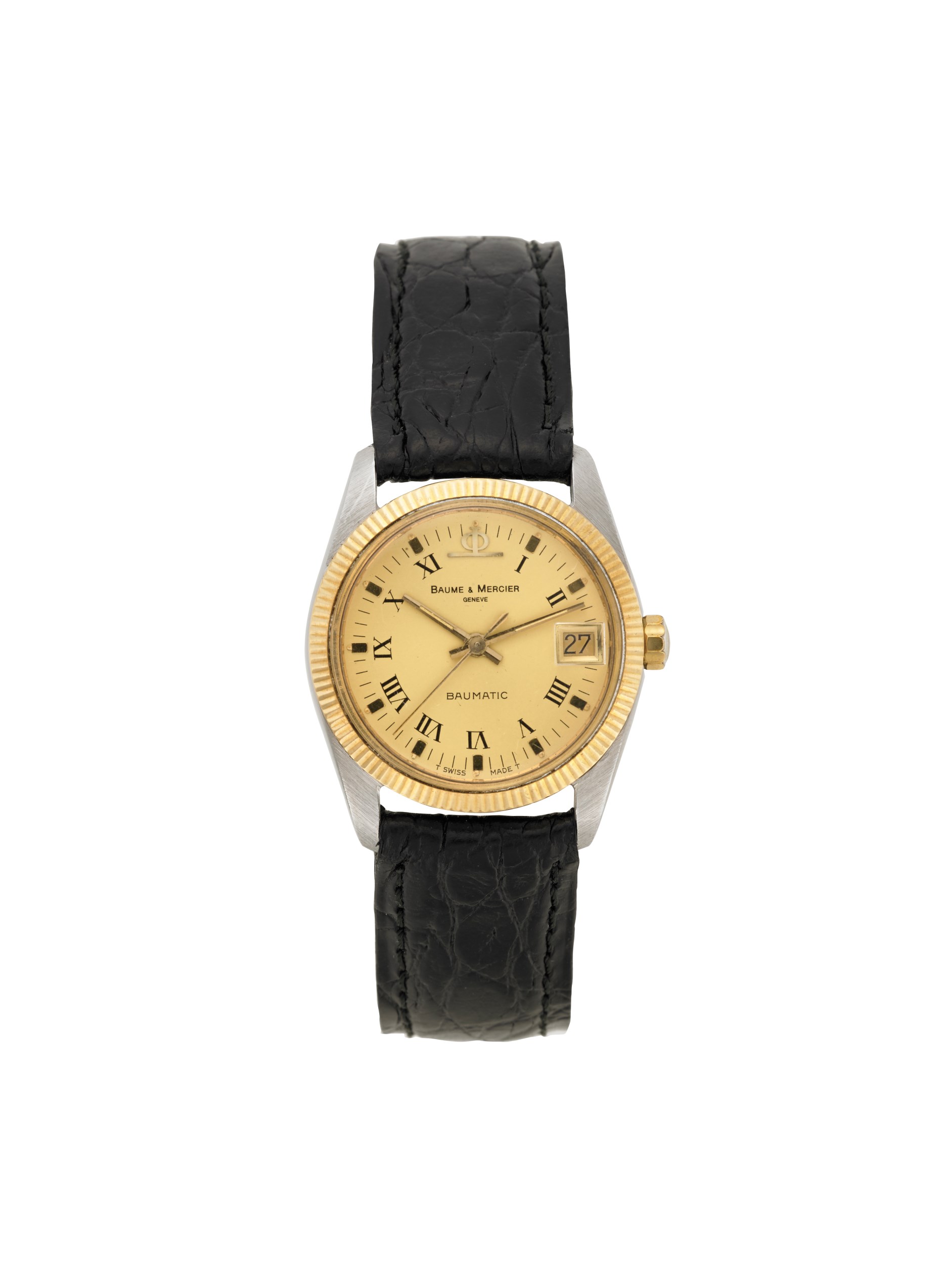 BAUME & MERCIER Orologio da polso da donna in acciaio e oro 18K Fine anni '90 Quadrante, movimento e cassa firmati Movimento con carica automatica Quadrante champagne con indici riportati e cifre romane, finestrella per data Cassa n. 851852 Diam. mm 31 In scatola originale BAUME & MERCIER Lady's 18K gold and steel wristwatch Late 1990s Dial, movement and case signed Automatic wind movement Champagne dial, applied indexes, Roman numerals Diam. mm 31 With original box