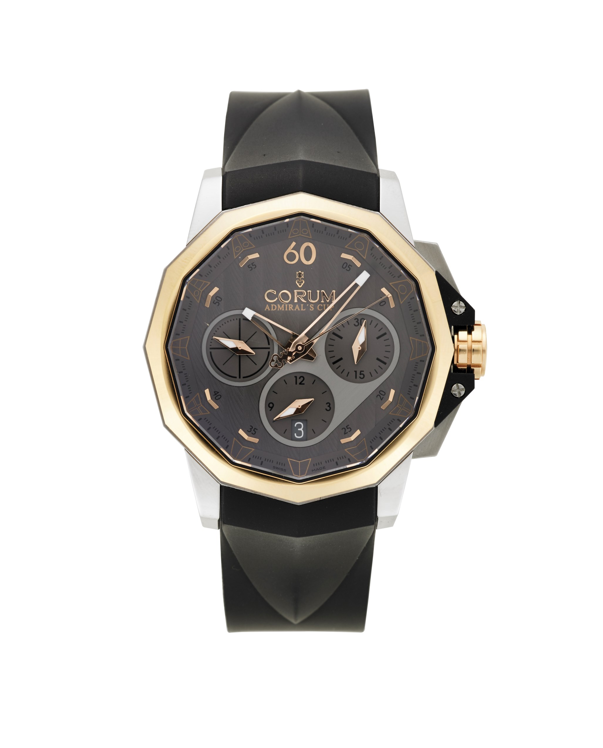 CORUM ADMIRAL CUP Orologio da polso da uomo in acciaio e oro 18K Epoca recente Quadrante movimento e cassa firmati Movimento con carica automatica Quadrante color lavagna, indici e numero arabo, quadrantini ausiliari, secondi al centro, finestrella per data Cassa n. 01/64 2279118 Diam. mm 42 CORUM ADMIRAL CUP Gent's 18K gold and steel wristwatch Recent production Dial, movement and case signed Automatic wind movement Grey dial, Arabic numerals, auxiliary dial Diam. mm 42