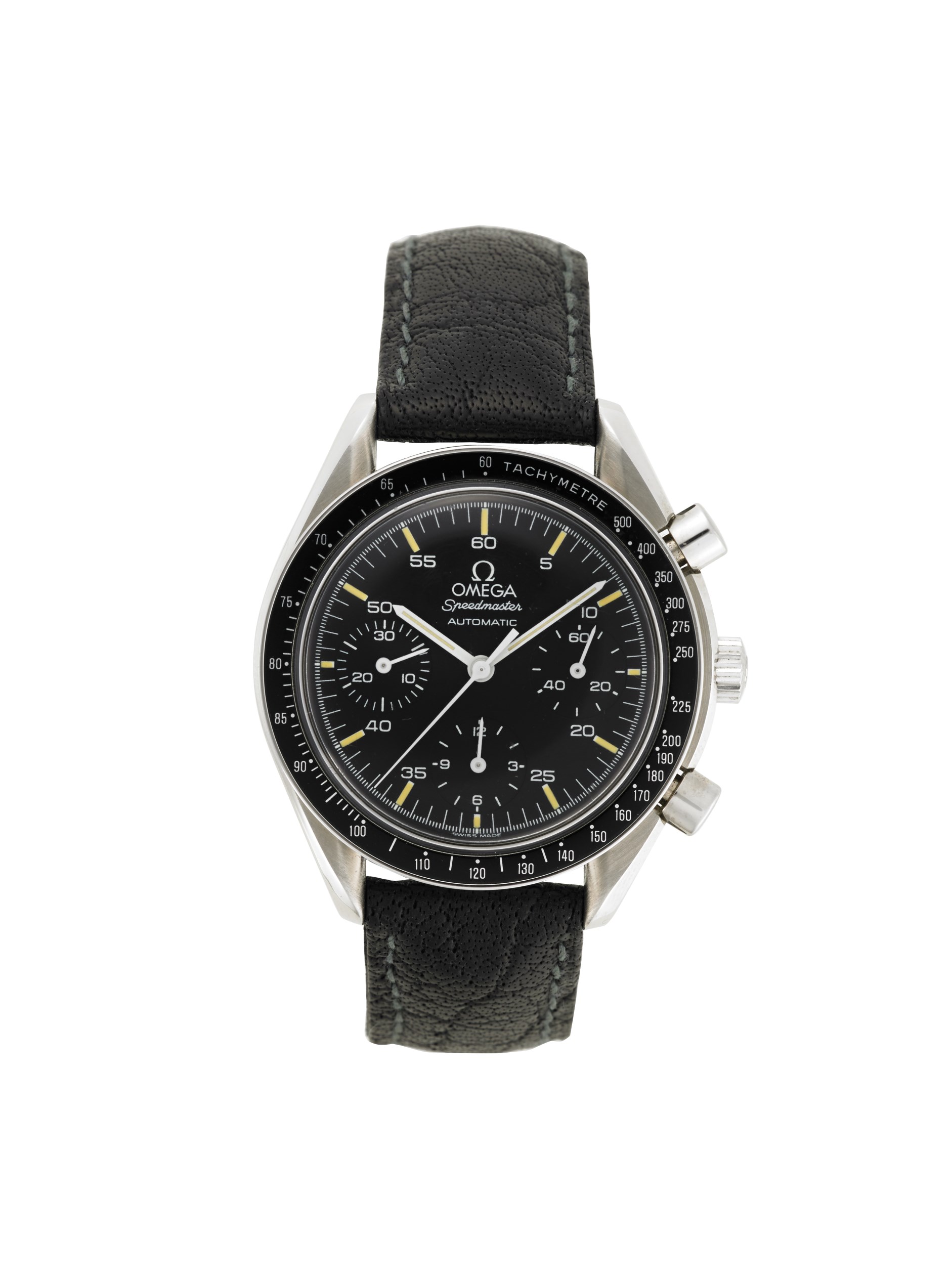 OMEGA Orologio da polso da uomo in acciaio Anni '90 Quadrante, movimento e cassa firmati Movimento con carica automatica Quadrante nero con indici e numeri arabi, secondi al centro, quadrantini ausiliari Cassa n. 53422635 Calibro n. 1140 Diam. mm 39 OMEGA Gent's steel wristwatch 1990s Dial, movement and case signed Automatic wind movement Black dial, indexes, Arabic numerals, auxiliary dials Diam. mm 39