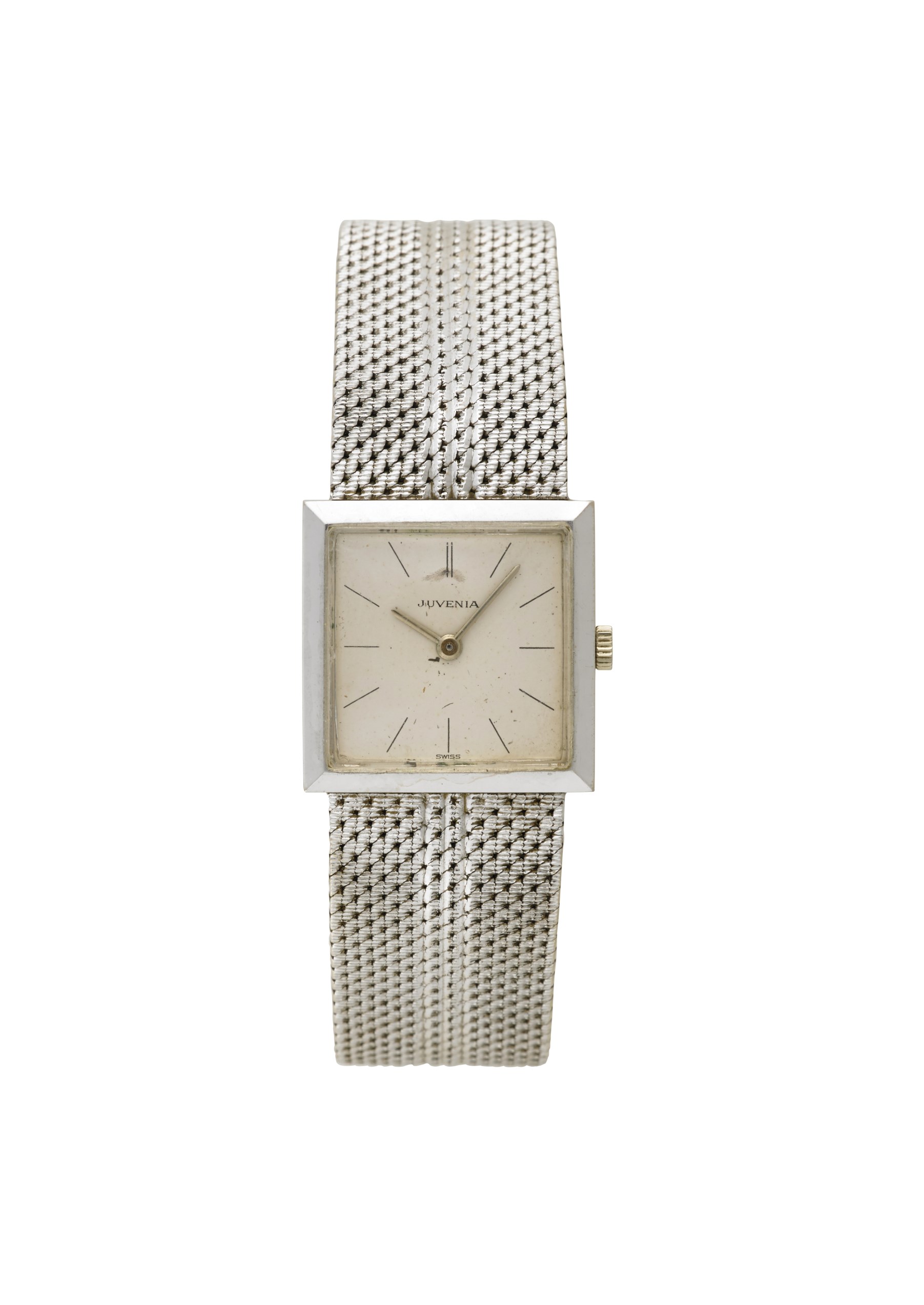 JUVENIA Orologio da polso da donna in oro 18K Anni '60 Quadrante, movimento e cassa firmati Movimento con carica manuale Quadrante argentato con indici Cassa n. 648282 Misure mm 22,5x22,5 JUVENIA Lady's 18K gold wriswatch 1960s circa Dial, movement and case signed Manual wind movement Silvered dial with indexes mm 22,5x22,5