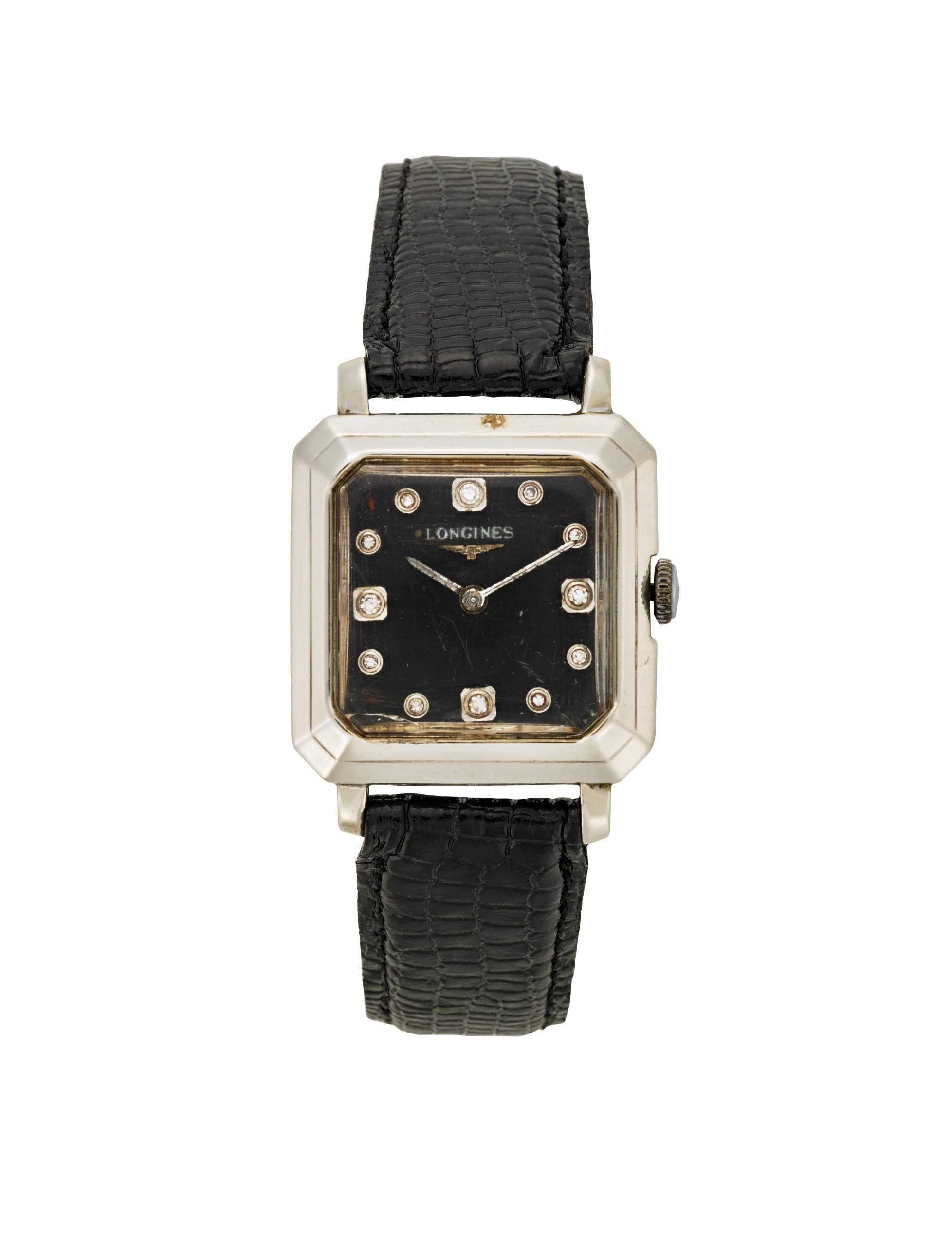 LONGINES Orologio da polso da donna in oro 14K Anni '50 Quadrante, movimento e cassa firmati Movimento con carica manuale Quadrante nero con indici riportati con piccoli diamanti Cassa n. A68015 Misure mm 28x27 (difetti) LONGINES Lady's 14K gold wristwatch 1950s Dial, movement and case signed Manual wind movement Black dial, indexes with diamonds mm 28x27 (defects)