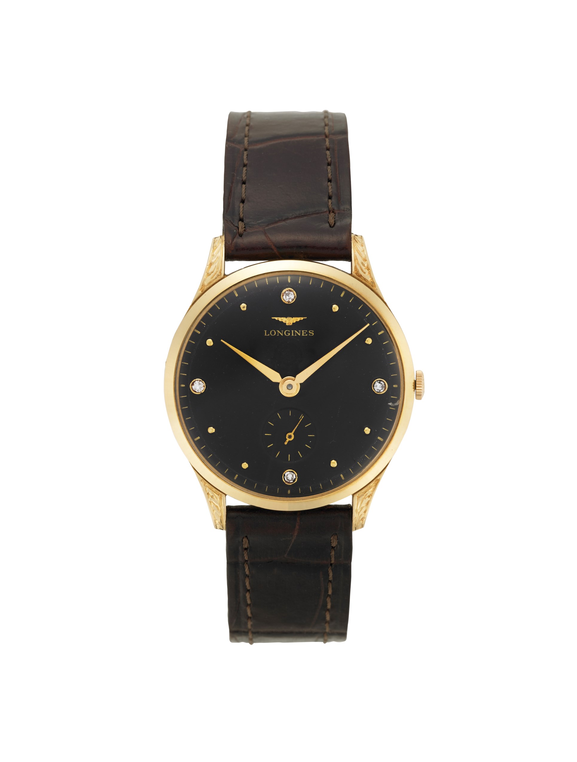 LONGINES Orologio da polso da uomo in oro 18K Anni '50 Quadrante e movimento firmati Movimento con carica manuale Quadrante nero con indici riportati e diamanti alle ore 12,3,6 e 9 Movimento n. calibro 27M n. 10535609 Diam. mm 35 (quadrante ristampato, cassa non originale) LONGINES Gent's 18K gold wristwatch 1950s circa Dial and movement signed Manual wind movement Black dial with applied indexes and diamonds Diam. mm 35 (Dial reprinted, case not pertinent)