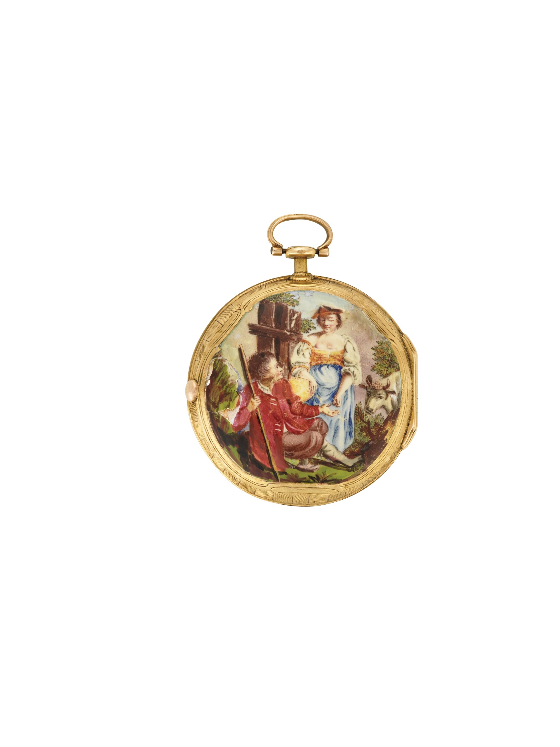 JA b Melly, PARIS Orologio da tasca da uomo in oro con cassa e controcassa smaltata Epoca seconda met‡ sec. XVIII Movimento con carica a chiavetta Quadrante bianco con numeri arabi e cifre romane Diam. mm 43 (difetti e restauri) JA b Melly, PARIS Gent's 18K gold and enamel pocket watch Second half 18th century Key-wind movement White dial, Roman and Arabic numerals, Diam. mm 43 (defects and repairs)
