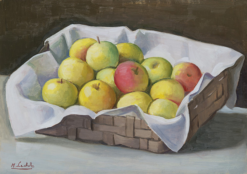 Marius Ledda (Cagliari 1880 - Roma 1965) "Cesto con mele" olio su compensato (cm 33x46) Firmato in basso a sinistra In cornice