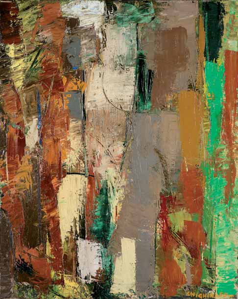 Alfredo Chighine Milano 1914 - Pisa 1974 Composizione, 1955 olio su tela, cm 100x80. Firmato e datato in basso a destra: Chighine 55. Titolato, datato al verso: Composizione, cm 100x80 – 9-1955. Provenienza: Milano, Galleria del Milione (etichetta e timbro al verso sul telaio); Roma, La Salita Galleria d’Arte Contemporanea (etichetta al verso sul telaio).