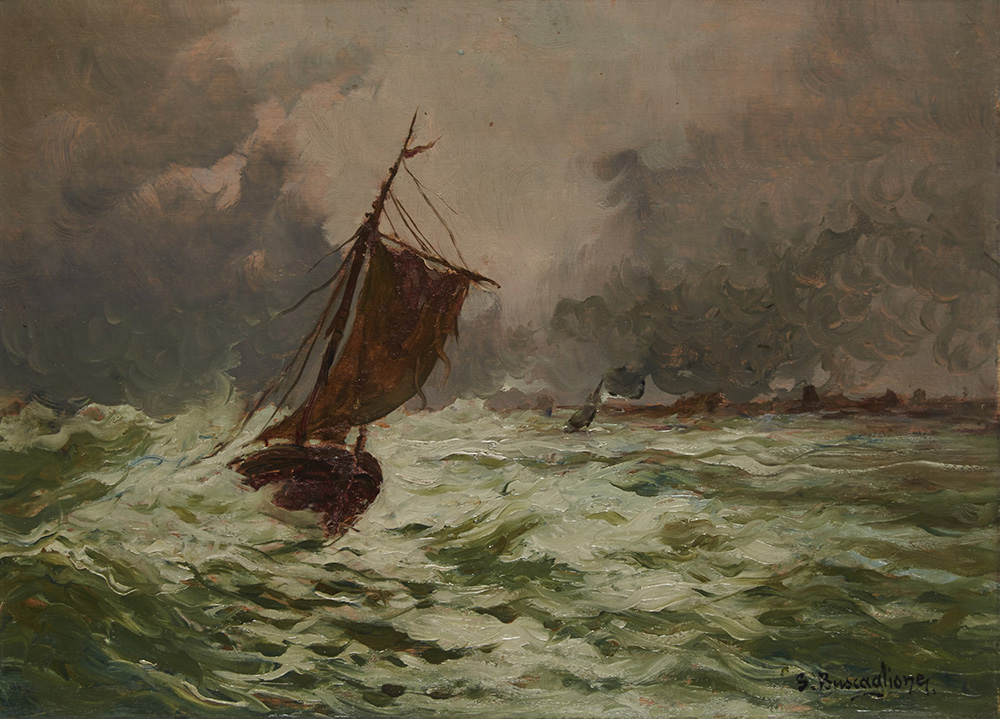 Giuseppe Buscaglione (Ariano Irpino 1868 - Rivoli 1928) "Soccorso" olio su tavola (cm 31.5x44) Firmato in basso a destra Al retro: titolato ed iscritto In cornice