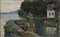 Clemente Pugliese Levi (Vercelli 1855 - Milano 1936) "Scorcio lacustre con barche" 17.8.1888 olio su tavoletta (cm 19x30) Firmato e datato in basso sulla destra Al retro: iscritto e datato In cornice