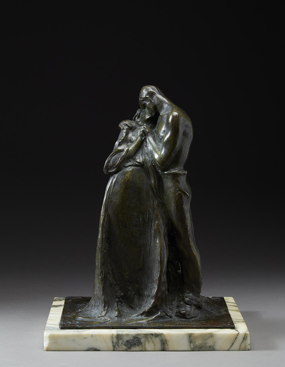 Angelo Montegani (Milano 1891 - 1959) "Il bacio" scultura in bronzo (h cm 40) poggiante su basamento in marmo Firmata alla base; timbro di Fonderia (lievi difetti)