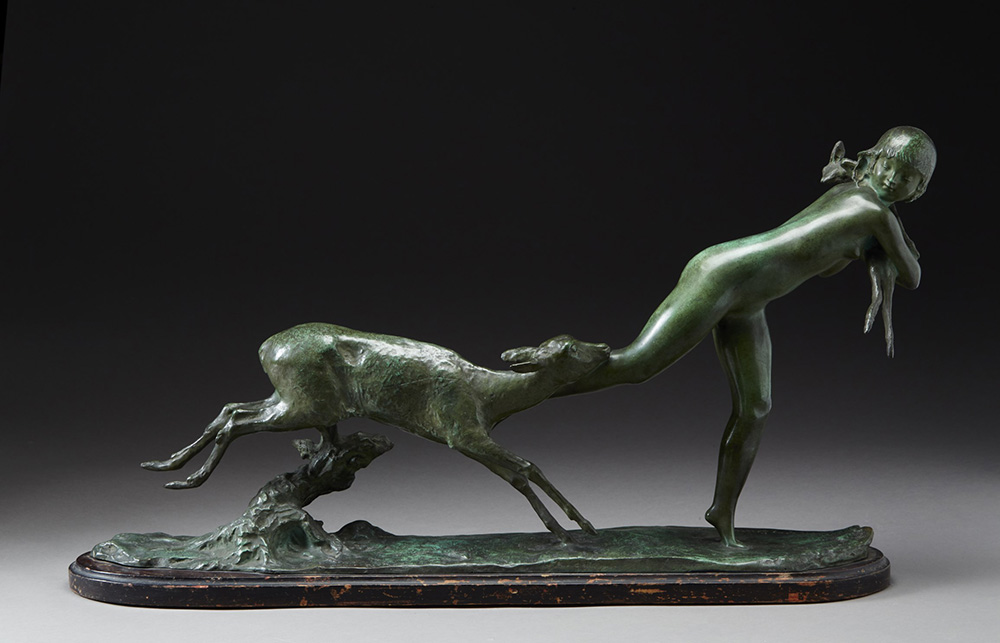 Ary Jean LÈon Bitter (Marsiglia 1883 - Parigi 1973) "Fuga dal cerbiatto" scultura in bronzo (cm 74x41x13) poggiante su base in legno Firmata alla base Esposizione: 1937, Esposizione Internazionale d'Arte di Parigi. Cartiglio sotto la base