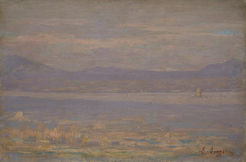 Emilio Longoni (Barlassina 1859 - Milano 1932) "Lago di Garda" olio su tela applicata a cartone pressato (cm 26.5x40) Firmato in basso a destra Al retro: firmato, titolato; timbro del pittore Giuseppe Mascarini, Milano In cornice