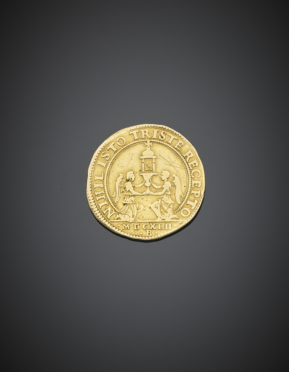 MANTOVA. Ferdinando Gonzaga (1612-1626). Da 2 doppie o quadrupla 1614 (gr.12,8), con abito cardinalizio. MIR 577/2. Oro. Molto rara. qMB