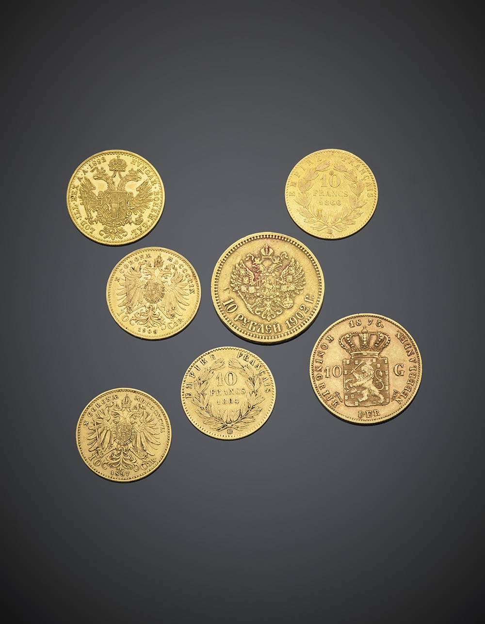 Lotto di 8 monete in oro: Russia 10 rubli 1902; Olanda 10 gulden 1875; Francia 10 franchi 1864/BB e 1866/BB; Austria, ducato 1892 (riconio di zecca) e 10 corone 1897 e 1909 , Gran Bretagna, Vittoria, mezza sterlina