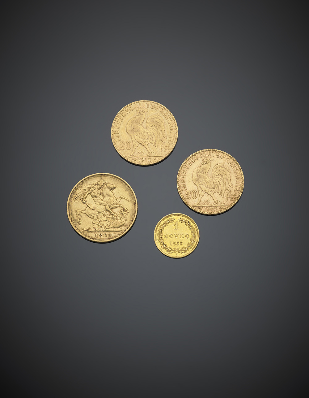 Lotto composto da quattro monete in oro: una sterlina della regina Vittoria anno 1888, due monete da 20 franchi della Repubblica francese del 1905 e del 1913, ed uno scudo di Pio IX del 1853, complessivi gr. 22,50
