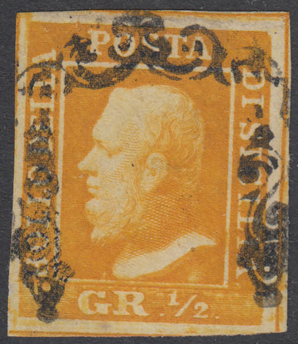[SICILIA] 1859 1/2 grano arancio, I tavola, carta di Napoli. A. Diena, cert. A. Bolaffi Used..........(Sass. 1a)