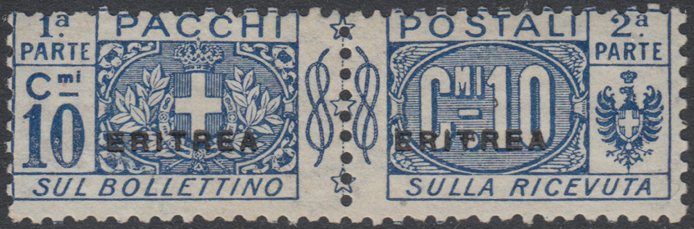 [ERITREA] 1916 Pacchi postali, 10c. azzurro "Nodo di Savoia". Cert. Raybaudi MNH..........(Sass. 2)