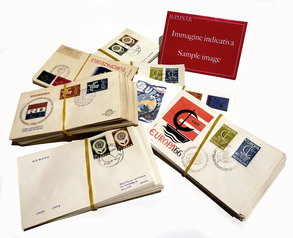 [EUROPA CEPT] 1957/1975 Lotto composto da oltre 7000 buste FDC affrancate con singoli, coppie, quartine, foglietti e coppie con interspazio dei seguenti paesi: Belgio, Cipro, Francia, Germania, Gibilterra, Irlanda, Islanda, Italia, Jugoslavia, Liechtenstein, Lussemburgo, Monaco, Olanda, Portogallo, San Marino, Spagna, Turchia. Insieme ordinatamente suddiviso in blocchi di buste identiche. Il tutto in 15 scatole. Da esaminare. FDC